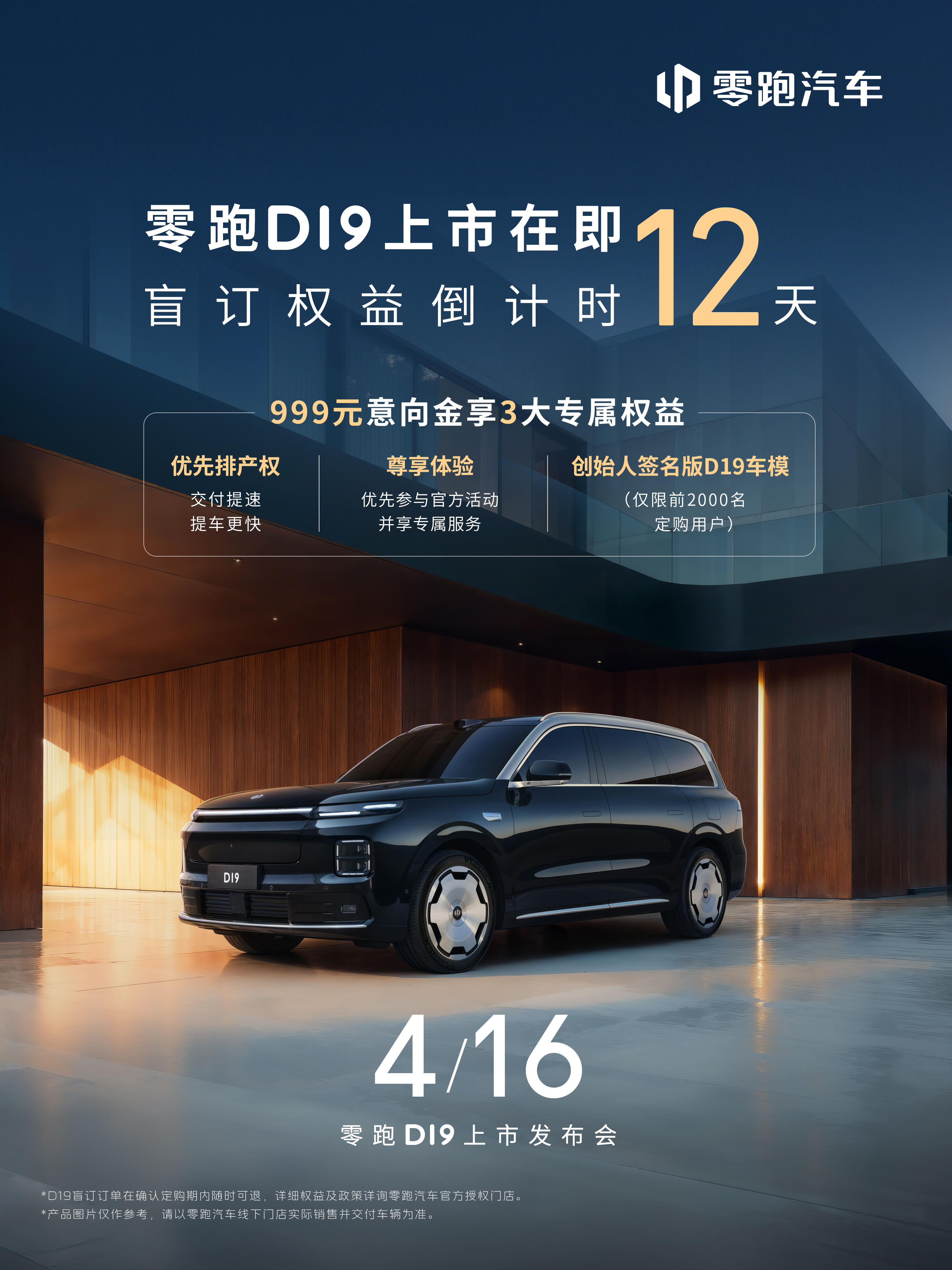 现999元意向金锁定限时多重权益✅优先排产,加速交付✅优先参与官方活动并尊享专属服务✅创始人签名版D19车模(仅限前2000名确认定购用户)欢迎到店品鉴,解锁旗舰级出行体验!4月16日正式上市,敬请期待!网页链接