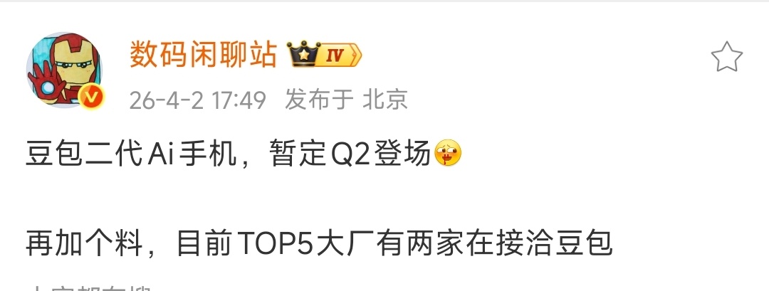 数码闲聊站 豆包二代AI手机Q2登场,TOP5两家大厂在接洽!