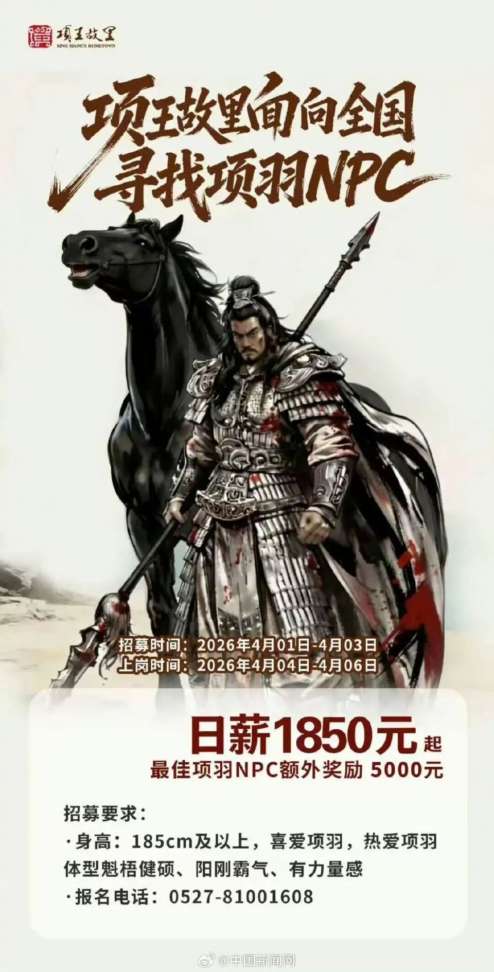 【宿迁全国招募项羽日薪是身高的十倍】宿迁全国招项羽身高越高日薪越高 这是真的身高能当饭吃啊!据扬子晚报,江苏宿迁项王故里景区面向全国招募项羽扮演者,在景区内与游客进行沉浸式互动。这份招募最大的亮点,莫过于独特的薪资计算方式——身高×10倍=日薪。扮演者身高需在185厘米以上,185厘米对应1850元/天,186厘米对应1860元/天,187厘米对应1870元/天……上不封顶,身高越高,日薪越高,且提供专业古装造型、免费食宿。截至4月2日上午8时,报名人数已超700人,由于报名人数比较多,将在4日进行海选。