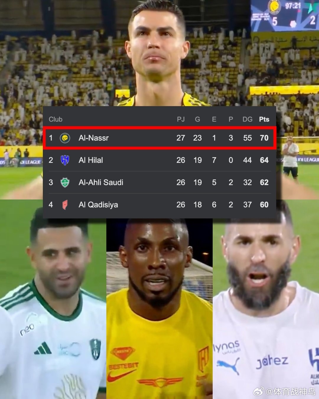 由C罗领衔的利雅得胜利在沙特联赛冠军争夺战中迈出了重要一步。没错,联赛还剩7轮,他们稳居沙特联赛榜首,无人能敌。他们领先于本泽马领衔的阿尔希拉尔、马赫雷斯领衔的阿尔阿赫利以及奎尼奥内斯领衔的阿尔卡迪西亚。