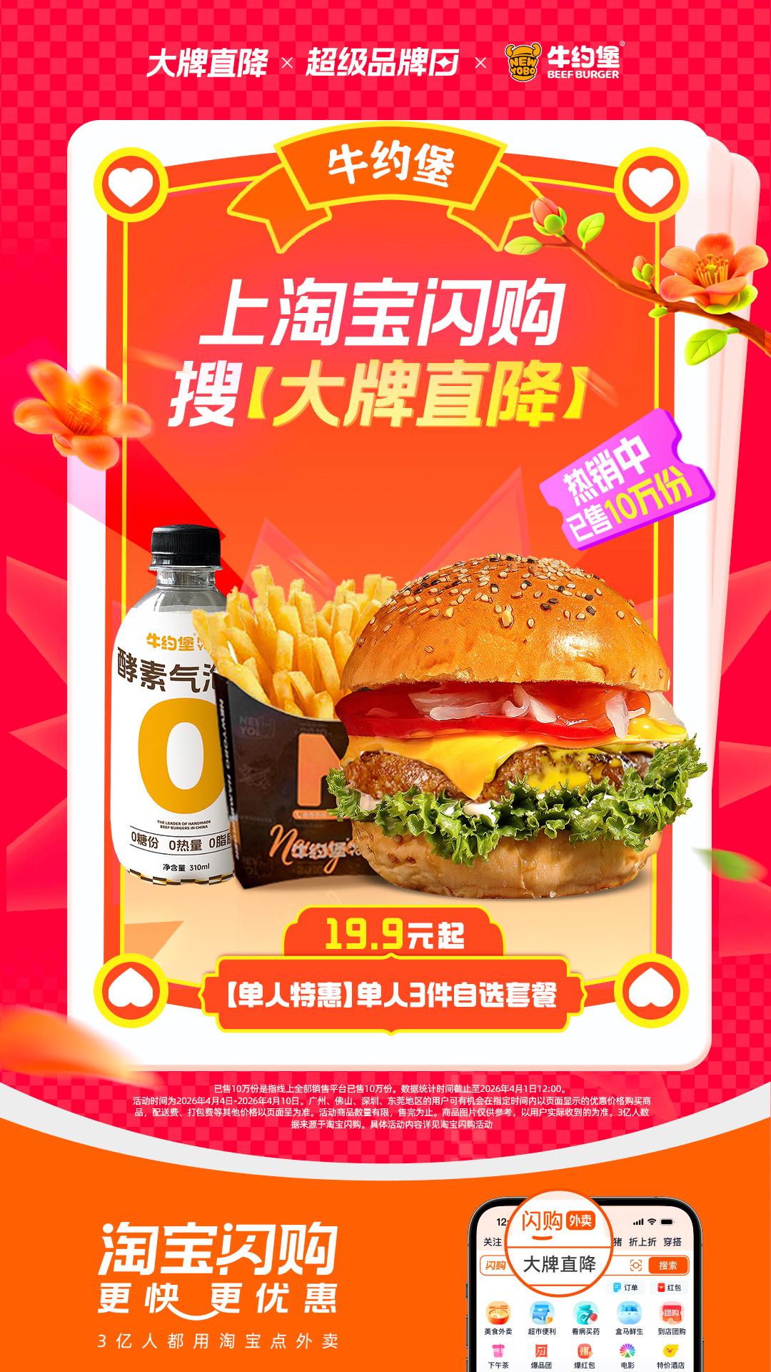 淘宝闪购大牌直降x超级品牌日淘宝闪购大牌直降春天当然要和姐妹去公园野餐发呆呀!我们提前在淘宝闪购下单了牛约堡,3件套19.9元起,人均一杯奶茶钱,就能get大牌汉堡套餐。在草地上大快朵颐,阳光微风配美食,这份春日松弛感直接拿捏!告别繁琐准备,享受即刻美味。 4月4日-4月10日,上淘宝闪购搜索【大牌直降】,牛约堡3件套19.9元起,参与答题赢1888元礼金、免单红包和限量周边。