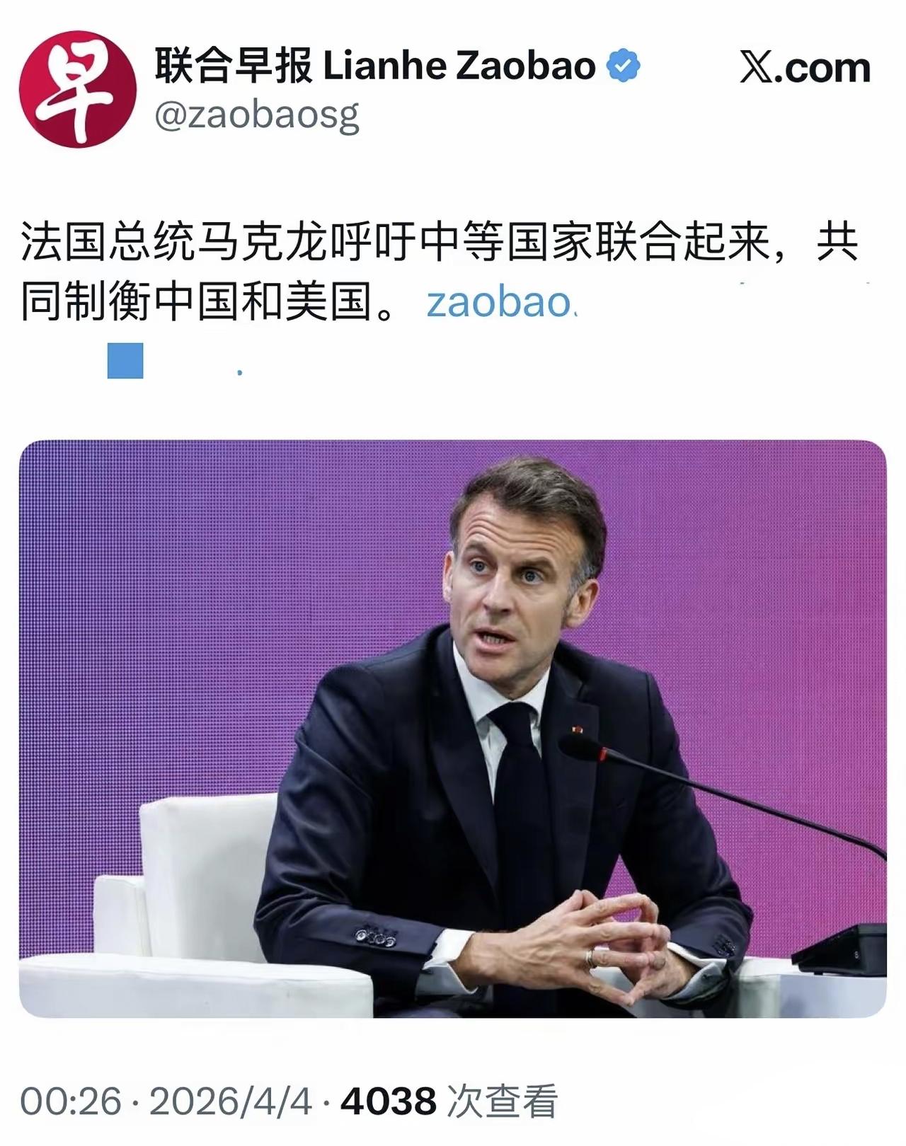 法国总统马克龙4月3日在韩国公开倡议,韩国、法国以及其他欧洲国家、加拿大、日本、印度、巴西、澳大利亚等应该组建一个相互尊重且独立于美国的联盟。 加拿大总理卡尼也曾在2026年的慕安会上提出应该组建一个中等强国联盟,似有异曲同工之妙。 不过,两者最大的区别在于,卡尼只是提议组建联盟,但马克龙却称组建联盟是为了共同制衡美国和中国。 马克龙,任上已经访问了4次中国,最近一次是2025年12月。