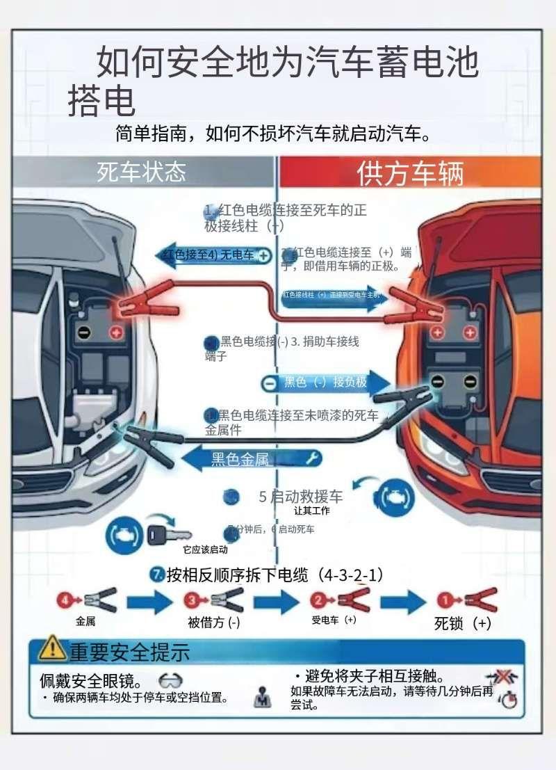 你真的确定,没把自己车的电脑主板烧了吗?😱🔋 冬天的每个早上,开车出门都像开盲盒:到底能不能打着火? 但很少有人知道,随便搭电(借电打火)接错一根线,搞不好就花钱修车上的电子系统。 很多人搭电的时候,都是凭着感觉乱接线,结果回头保险丝烧了,更严重的直接把车上的控制模块给烧了。 为了不让你在零下的寒风里傻等拖车,我整理了一套简单易懂的搭电步骤,用大白话讲清楚。 记住这套“黄金操作流程”,能帮你省下一大笔修车钱: 1. 红色线先接亏电车辆的正极(+)——先接亏电的那台车。 2. 红色线再接救援车(有电的车)的正极(+)——把两个正极连起来。 3. 黑色线接救援车的负极(-)——从有电的车取电。 4. 黑色线的另一端,接亏电车辆的金属部位(发动机缸体、车架螺栓这些)——这一步非常关键!别直接接亏电电瓶的负极!找个车身的金属部位搭铁,避免电瓶上方直接产生火花。 为什么不能直接接亏电电瓶的负极? 电瓶充电的时候会释放氢气。接最后一根线的时候,要是在电瓶上方直接打出火花,搞不好就会发生小型爆炸。接车身金属部位,就是你的安全保障。 拆线的时候,要按相反的顺序来(4-3-2-1): 先拆接在亏电车上的搭铁线,再拆救援车的负极线,最后再拆两个正极线。 🚀 赶紧把这个图片存下来! 哪怕今天你自己的车能打着火,说不定明天你自己或者朋友在停车场就用得上! 自己动手