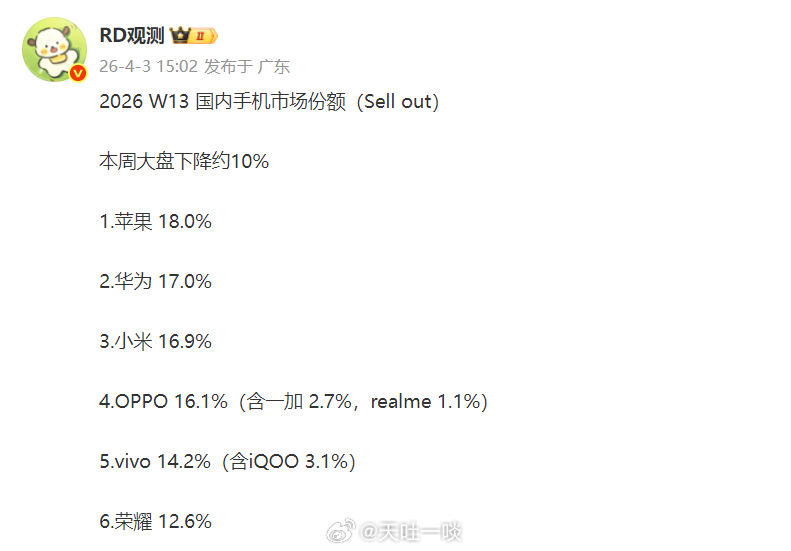 W13周的排名出炉了苹果蝉联第一,环比市场份额增加最多华为还是排名第二的品牌小米