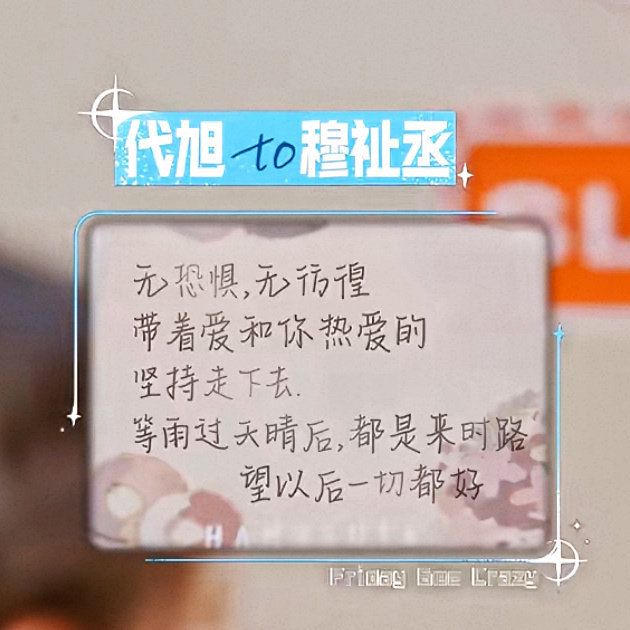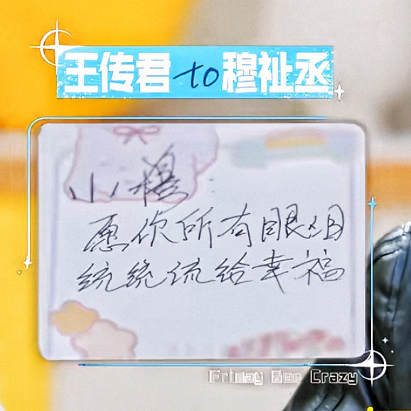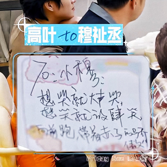 第一次见穆祉丞被12个人围着哄真的被高叶、王传君、代旭写给的纸条感动到了!高叶:小穆想哭就大声哭想笑就放肆笑。王传君:小穆,愿你所有眼泪统统流给幸福。代旭:无恐惧无彷徨带着爱和你热爱的坚持走下去,等风过天晴后都是来时路,望以后一切都好。穆祉丞真的在周五晚高疯里被哥哥姐姐宠的很好!