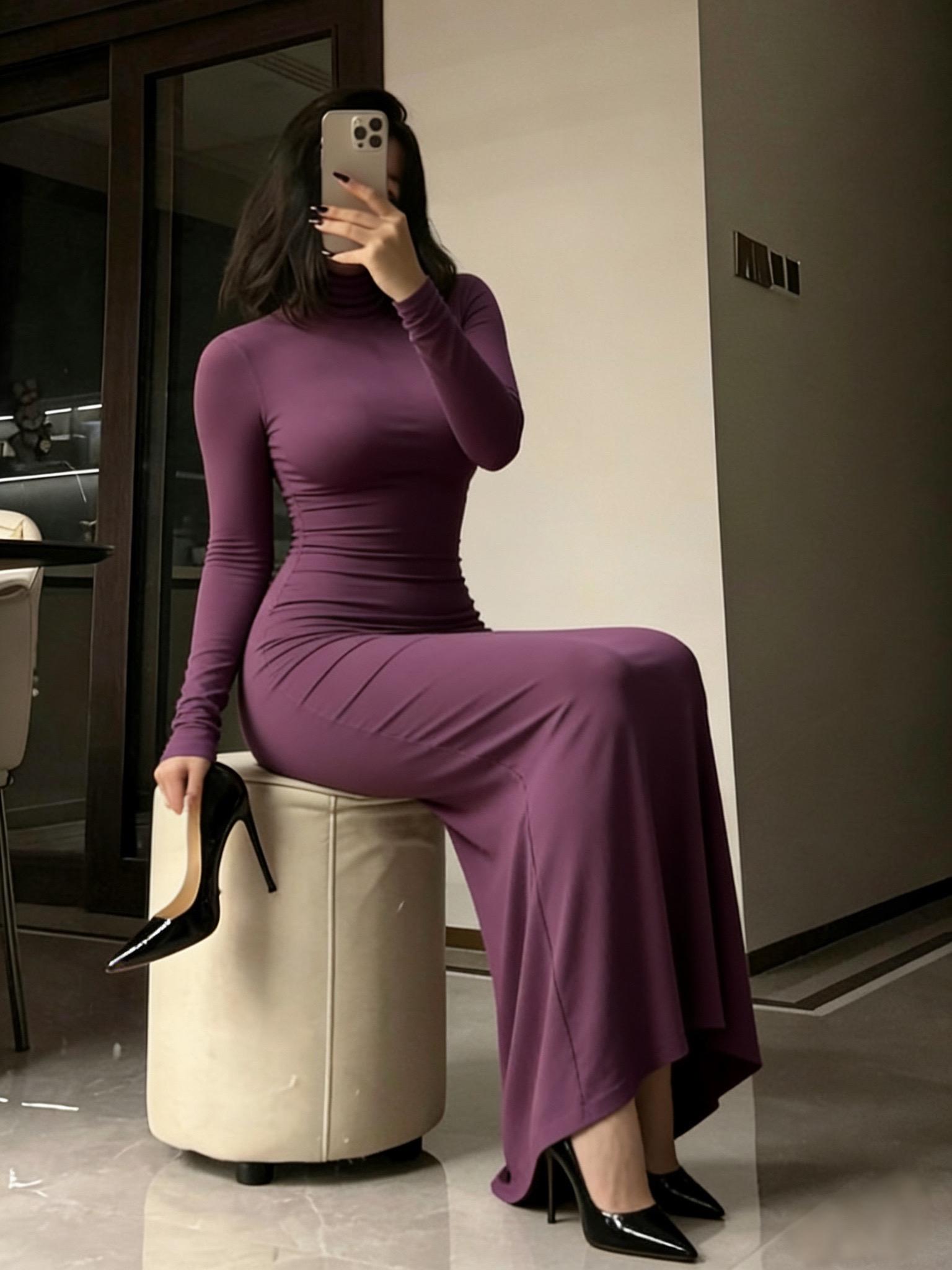 一袭长裙的御姐型美女,那气场简直绝了。就说穿搭,黑色丝绒包臀紧身长裙配黑色缎面吊