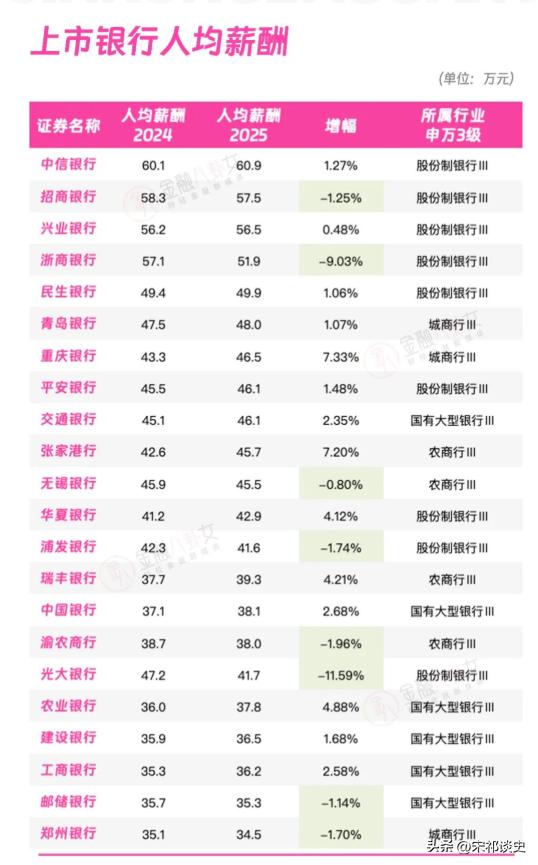 打脸!大家都被银行人骗了,天天喊降薪哭穷,年报一公布真相大白! 全网都在吐槽银行苦、柜员累、金融圈降薪,结果年报一出来,直接揭开遮羞布。 银行人根本没降薪,反而偷偷涨了,只有高管在大幅降薪! 20家上市银行里,12家人均薪酬上涨,中信银行人均超60万,招行虽连续四年降薪,人均仍有57万多。 六大行更实在,农行人均涨了1.8万,交行涨到46万,基层柜员、客户经理薪资都有提升。 反观高管,薪酬总额直降两成,16家银行高管降薪,郑州银行更是直接腰斩。 但有意思的是,董事长、总经理大多逆势涨薪,还有不少年薪超百万,甚至总经理比董事长挣得还多。 有人吐槽被平均,柜员全年涨不到1万,还被加任务;也有人说政策向一线倾斜,收入更稳不想跑路。 其实银行打得一手好算盘,砍高管成本、稳基层员工,业绩反而普遍上涨。 更省心的是,银行换帅潮放缓,基层不用再反复适应新领导。话说回来,你身边的银行人,今年真的涨薪了吗?