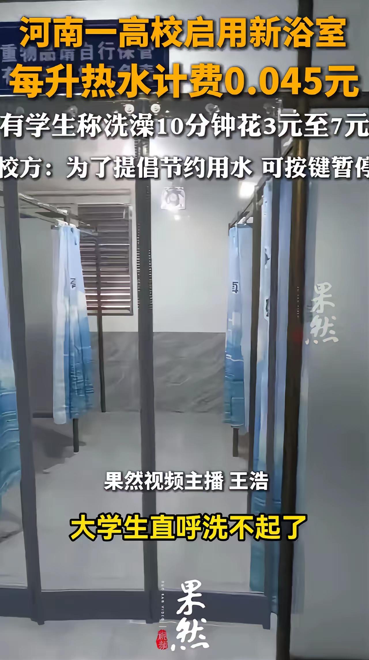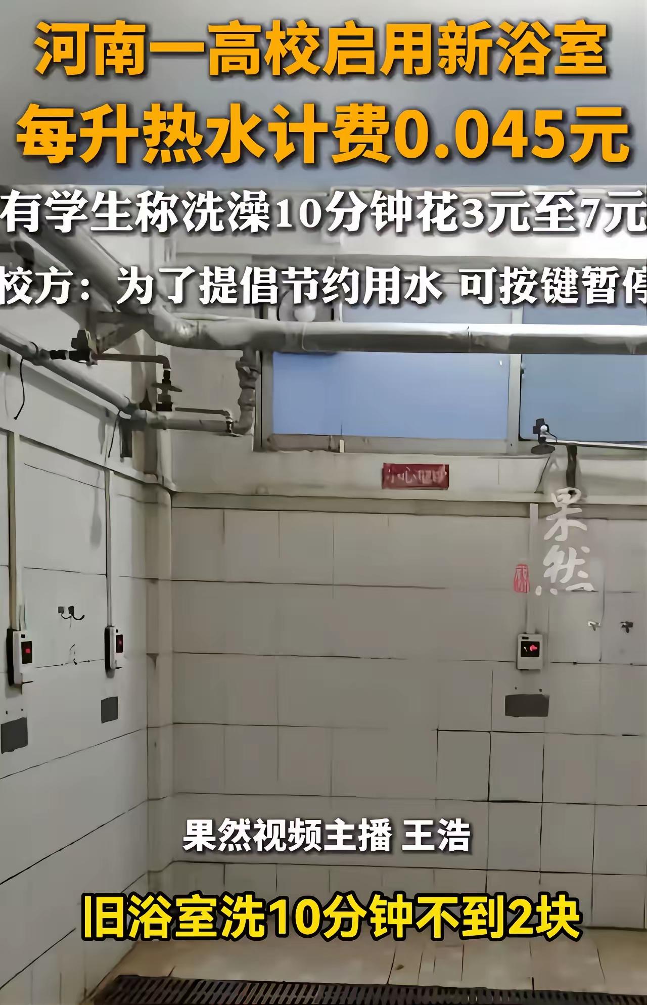 河南农大浴室收费引众怒,学生洗澡竟成奢侈事 洗十分钟澡花七块钱,河南农大学生直呼洗不起。这般收费标准,放在无收入的学生群体里,怎能不让人怨声载道? (个人观点仅供参考,无任何不良引导) 旧浴室设施简陋,收费却实在。单次洗浴花费不足两元,学生随心洗漱,无任何经济压力。校园本是育人净土,基础生活保障理当亲民,一句“民生在勤,勤则不匮”,道尽百姓对基础生活的质朴需求,学生的日常洗浴,正是最该被保障的基础需求。 新浴室一改旧制,推行流量计费。每升热水定价零点零四五元,看似单价不高,实则累积起来惊人。学生亲身实测,十分钟洗浴扣费三至七元,日常洗漱成了烧钱行为。 按月核算费用,每日洗浴的开销,累计下来超二百元。大学生依靠家中供给生活,无额外经济来源,这笔洗澡开支,无疑加重生活负担。盛夏时节每日必洗,这般花销,谁能长久承担? 浴室配套漏洞百出,更衣区不设插座。学生自带吹风机无法使用,只能依赖学校公共设备。试运营期间吹风免费,后续收费隐患难消,本就高昂的洗浴成本,再添未知花销,学生满心无奈。 校方回应冠冕堂皇,称计费为提倡节水,建议洗澡按暂停键。这般说辞,全然不顾学生实际需求,怎能服众? 网友听闻此事,纷纷怒斥其本末倒置。节水有万千合理方式,不该以高价压榨学生。高校以育人为本,绝非盈利场所,借节水之名谋私利,实在有失教育本心。 设施改造意在便民,而非增负。节水理念值得推崇,方式却要贴合实际。学校需倾听学生心声,调整合理收费,守住服务本心,莫让暖心工程,寒了万千学子心