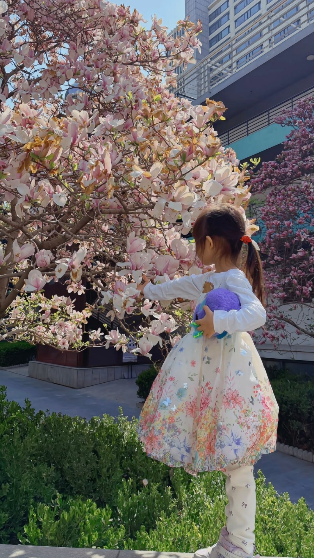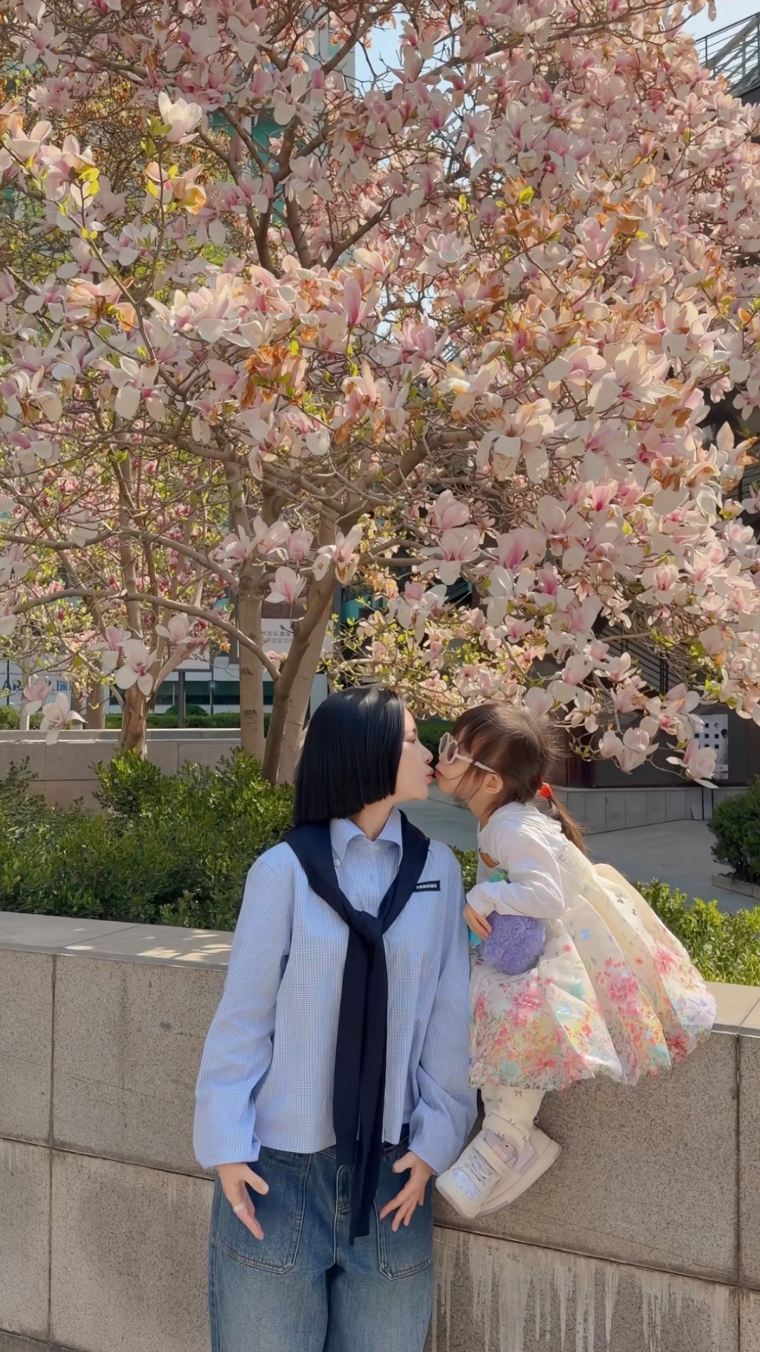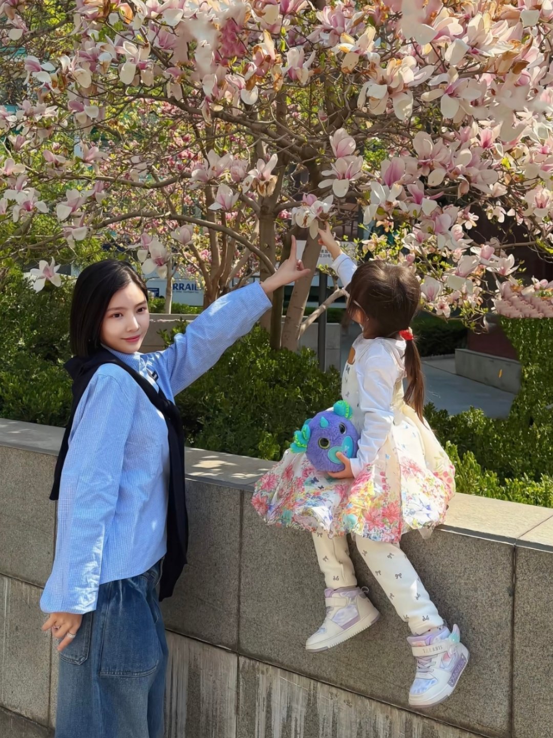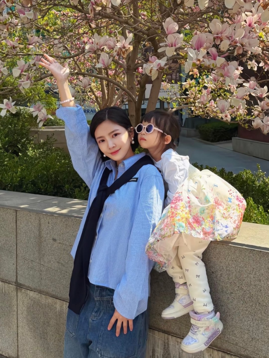 杜淳老婆王灿晒和女儿的赏花照,王灿发文说因为女儿太可爱了,所以完全不想生二胎。