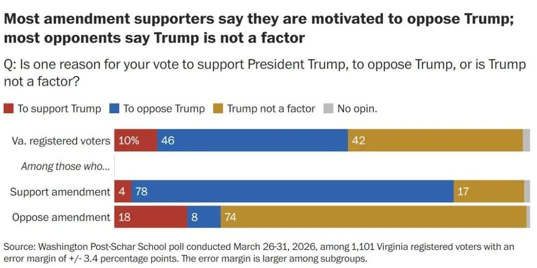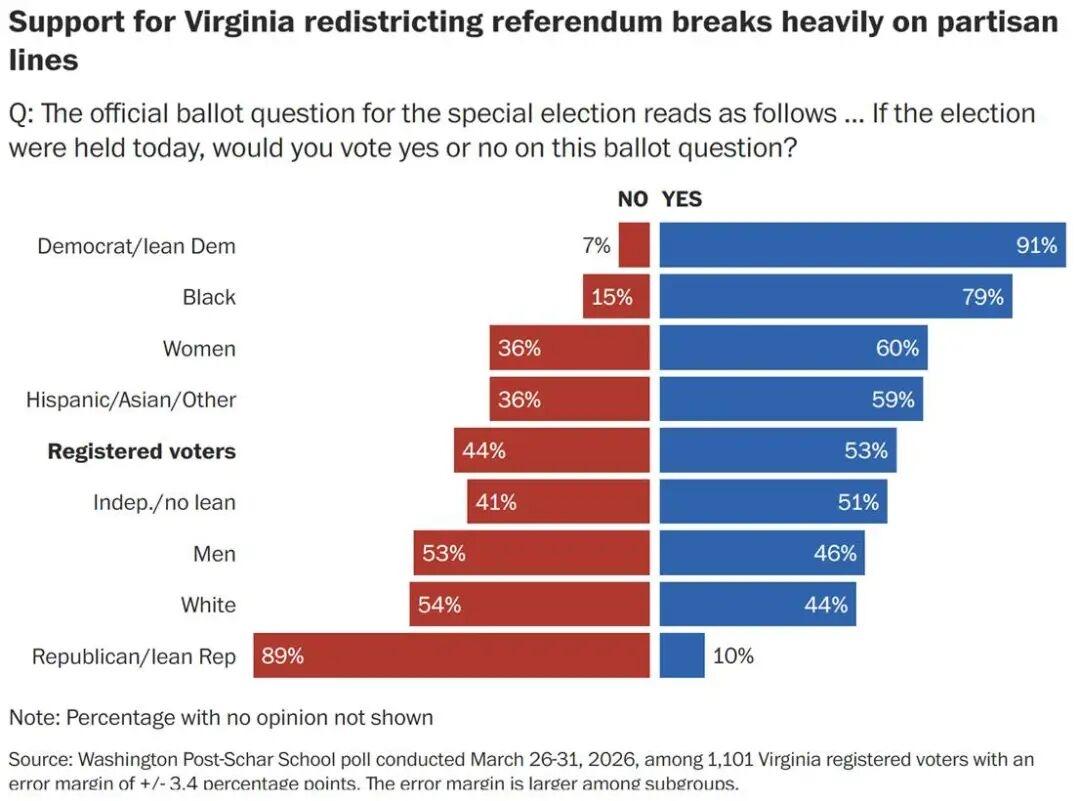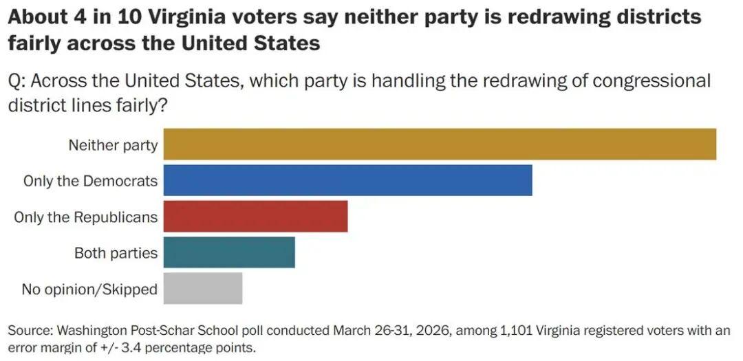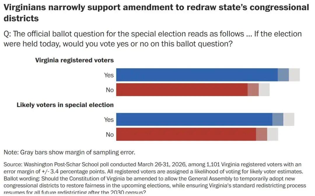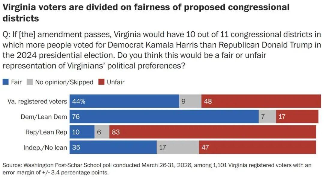 据《华盛顿邮报》和Schar School进行的民调显示,52%的弗吉尼亚州选民支持一项重新划分选区的提案,该划区方案可能在今年11月的中期选举中使民主党在众议院最多增加4个席位。不过,该民调也发出警示信号:随着4月21日公投前提前投票的进行,结果仍可能出现变数。共和党人及该方案反对者的投票热情高于民主党人及其支持者。 图片来源于网络