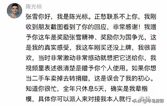 既然自己提出将劳斯莱斯赠予张雪,那主动方就应该是自己,怎么可能联系不上?一会儿等你消息,一会儿要求派人对接,一会儿又是奖励,这不成了施舍了嘛。既然赠予别人,或捐或用是受赠方的事儿,处处设条件就让人怀疑动机了。