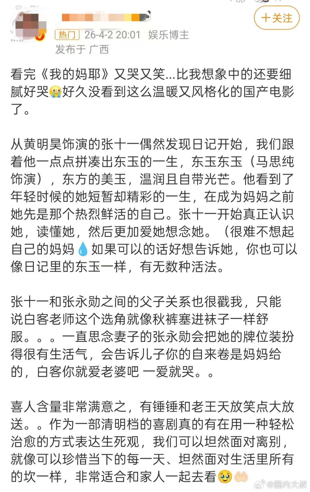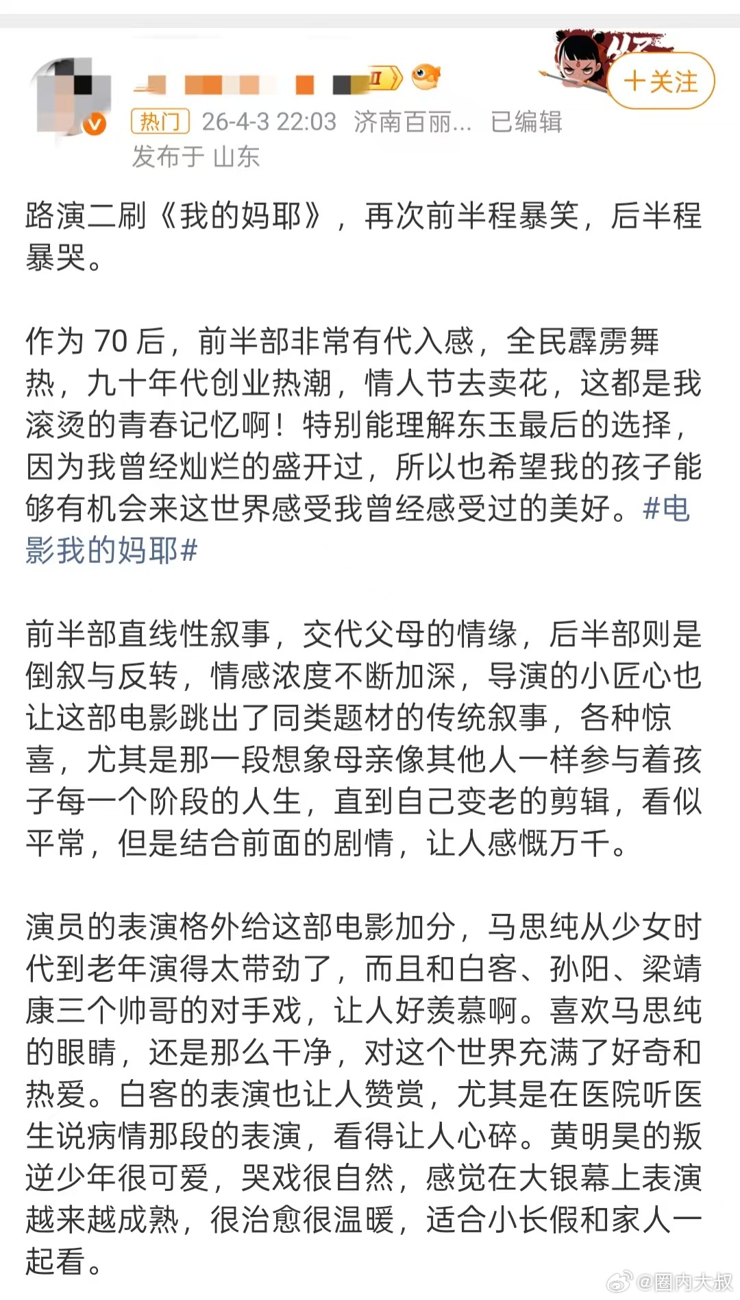 马思纯新片口碑《我的妈耶》口碑真的稳了!马思纯演技全程在线,将母亲的坚韧与女孩的纯真融合得恰到好处,彻底打破符号化形象,把东玉演活了。日常烟火气里藏着最深的温柔,好哭又好笑,越看越上头,强烈推荐大家去影院观看!