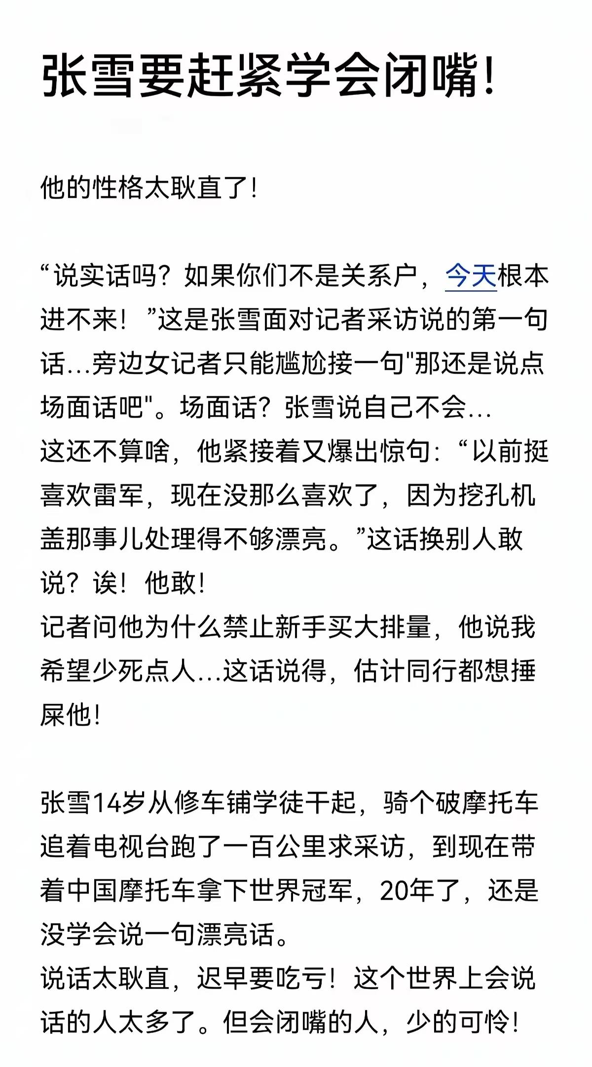 张雪要赶紧学会闭嘴了!你可以不圆滑也可以不世故,但是一定要管住嘴巴,说不定哪天就得罪一个可以覆灭自己的存在。 懂人情世故的把心思都放在人情世故上了,哪有精力再去钻研技术,坚持自己。 被人情世故太过束缚 ,就不会在某一个行业做到极致的热爱和坚持,也不会最终站在世界之巅。 陈光标送车这个事,这回复可以说不要,不应该说卖二手车然后去捐款,这陈成什么了,陈格局不大早骂人了。 开始他不是真想送,只是想送使用权,要不是张雪这句话,他不会说真送的。 你以为张雪开不起劳斯莱斯吗?做生意的都知道怎么回事,如果只是使用权那就是玩人。 陈要是格局大,就不会给没有汽车驾照的张雪送汽车了,流量嘛,老板有老板的蹭法儿!