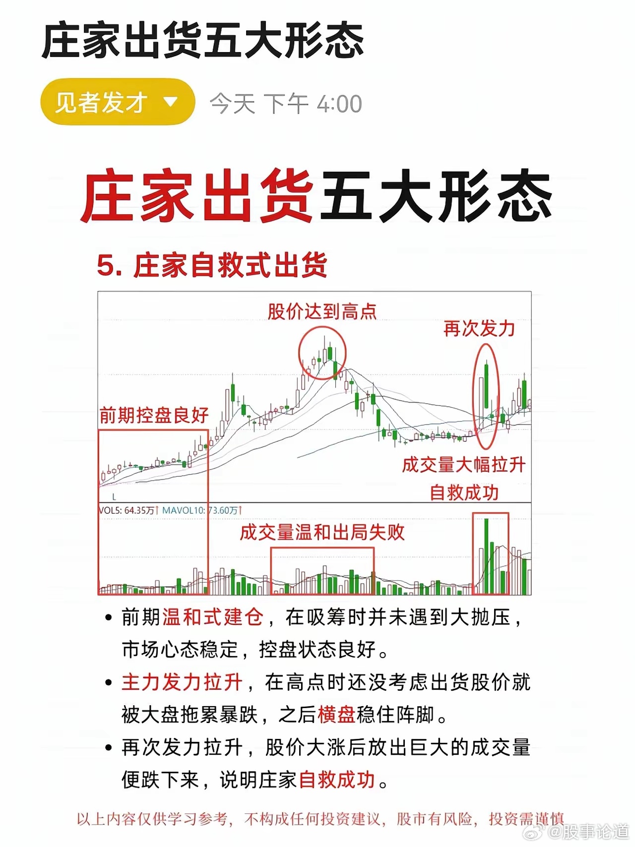 庄家出货五大形态,看透主力底牌!股市中,很多散户抱着“还能涨”的幻想,在山顶站岗到天荒地老。说白了,不是你运气差,是压根没读懂庄家的心思。主力坐庄,吸筹、洗盘、拉升、出货,每一步都藏着信号,而出货是最致命的一步——看懂形态,你能落袋为安;看不懂,就是给主力买单。主力出货从来不是悄无声息,记住:稳步缩量涨,主力没离场;剧烈放量震,出货要逃命。别妄图卖在最高点,也别被主力的诱多套路迷惑,看懂这五大出货形态,守住自己的利润,比什么都强。毕竟,会买的是徒弟,会卖的才是师傅。今日看盘股票