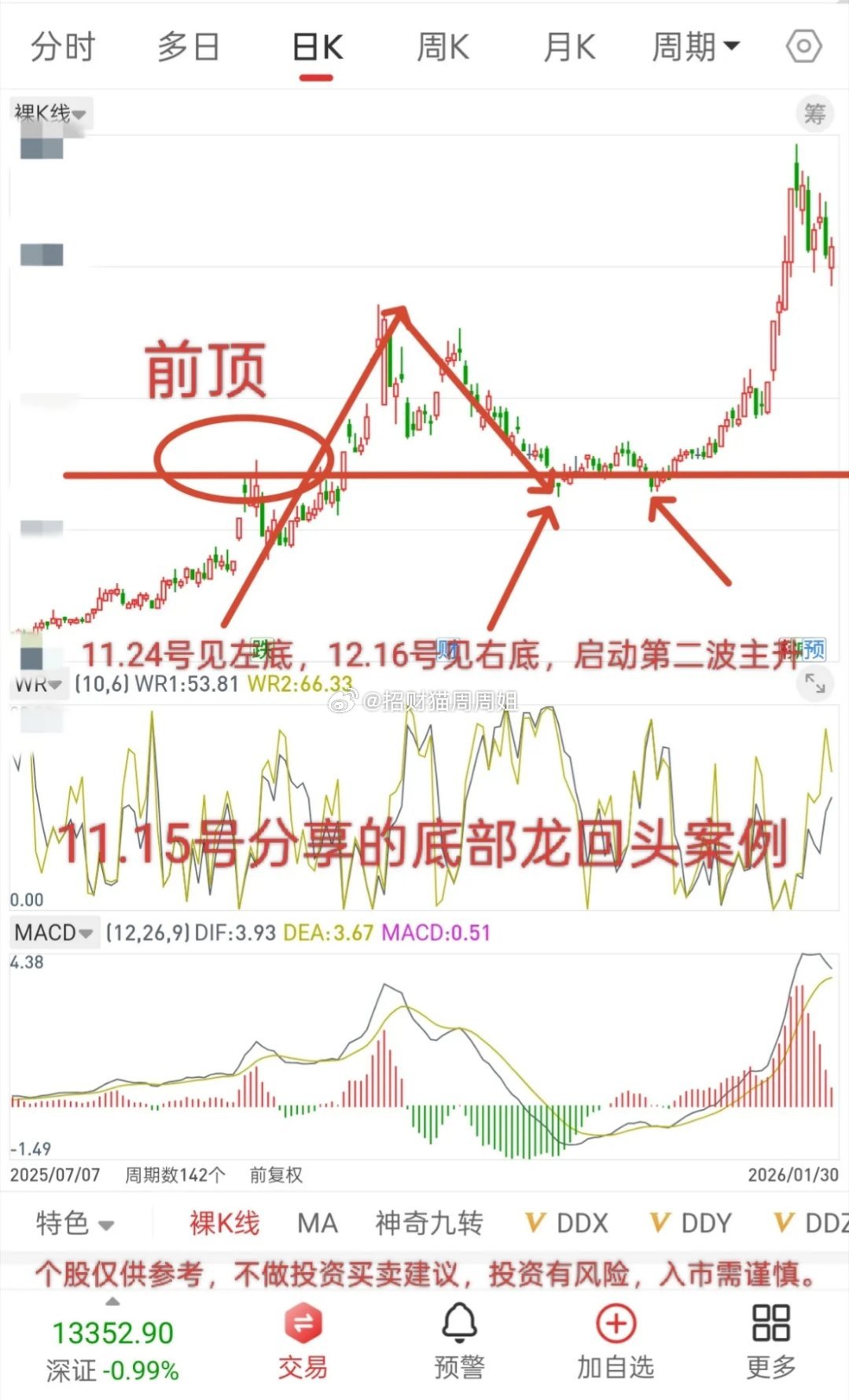 去年11.24-12.16,大盘产生左底和右底,但是这期间产生很多底部龙回头,我昨晚说分三种,第一种是11.24号见左底,然后没有跟随大盘筑双底,直接率先启动第二波主升;第二种是11.24见左底,12.16见右底,然后启动第二波主升,跟大盘一致;第三种是12.16号见底,然后直接启动第二波主升,(对应下图)。
