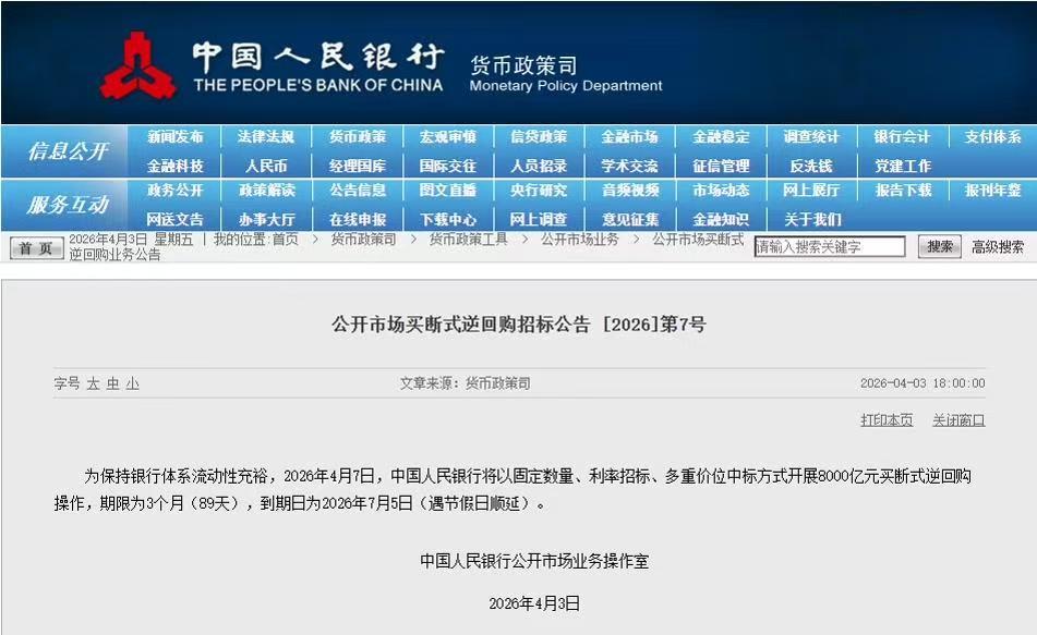2026年4月7日,中国人民银行向市场递出一个重镑信号,一笔高达8000亿元的买断式逆回购操作正式落地。这笔钱有着明确的到期日,锁定在2026年7月5日,遇节假日顺延。普通人看这串金融术语可能一头雾水,换个接地气的说法,这就是央行在给整个银行体系直接“输血”,确保大家手里都有充裕的流动性去周转。 要弄明白这笔钱的分量,得先拆解“买断式逆回购”这个略显生涩的词。这项工具并非新鲜事物,早在2024年10月28日,央行就正式将其推向台前。操作逻辑其实很直白:央行出面,从大型商业银行这些一级交易商手里买下债券,双方签个协议,约定3个月后交易商再把一模一样的债券买回去。这3个月期间,债券的所有权完全归央行,这就是“买断”二字的精髓。对应的操作期限,这次定的是89天。 以往大家常听到的质押式逆回购,债券只是被“押”在央行这里,拿不到市场上去二次流通。买断式操作彻底打通了这个环节。商业银行把手里的国债、地方政府债券、金融债券甚至公司信用类债券卖给央行换成现金后,这些债券的处分权就转移了。银行拿钱去放贷、去平账,整个金融市场的死水就这样被搅活了。 细看这份操作说明书,处处透着精密。8000亿元的固定数量,采用利率招标、多重价位中标的方式。这就好比央行摆了个拍卖场,定额卖8000亿的“水”,各家银行自己报利率,谁出的价高谁先拿,最终按照各自报价成交。这种机制能最真实地摸底市场资金的真实渴求程度,避免资金被廉价套利。 回顾这项工具的进化史,力度堪称节节攀升。2024年10月刚面世时操作了5000亿元,到了2025年1月直接飙升至17000亿元,同年10月又抛出11000亿元的3个月期操作。就在2026年3月6日,同样刚刚进行过一次8000亿元的操作。短短不到半个月,同等量级的操作再次落地,这种高频次、大额度的投放节奏,足以说明当前市场对流动性的需求非常旺盛。 把视线从金融圈拉回咱们普通人的生活,这8000亿跟老百姓有啥关系?银行是经济的血脉,当银行手里握着充裕的现金,企业去贷款扩产、买房人去办按揭、甚至小微企业去申请周转资金的门槛和利率都会随之松动。资金面宽松了,股市、债市的情绪也会得到实质性的提振。看懂央行的这些公开市场操作,其实就是掌握了观察宏观经济温度的一把钥匙。不盲目跟风焦虑,看清资金流向的底层逻辑,这才是面对复杂经济信息时最实用的生存技能。 以上内容仅供参考和借鉴