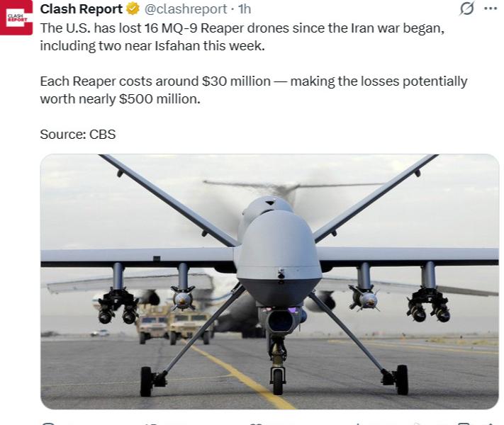 美国已经损失16架死神无人机! 从2月28日到4月3日,16架MQ9死神无人机在中东地区被击落和坠毁。不过在4月3日当天,一架疑似阿联酋的翼龙II察打一体无人机,也已经损失,参考图二和图三,单价不会超过300万美元一架的水平。 但是美国每架死神无人机,造价约3000万美元,此次损失总价值或近5亿美元。而且这还不是最后的损失,后续还要继续损失死神无人家,这个大家应该都明白。 事实已经证明,无人机在战场作战,其实就是一个纯的消耗品,就是一个快消品。所以说死神无人机以前损失一两架,感觉就是一个很重大的事件。结果后来现在一二十架的损失,大家反而习以为常,觉得无所谓了。 无人机本身就是用来做消耗品的,被击落一架之后,再重新修建修建造一架就好了,又不损失飞行员。可能是大家也对战争的损耗,已经有了一个更清醒的认识了。 当然那架疑似翼龙二无人机,被击落也是正常的,因为对手也有自己的防空导弹。反正无人机买了并不是留着看家护院的,是要关键时刻能打出去的。今天损失一架,明天接着买一架就是了,反正中东的大户就是有钱,无非就是多挖几桶石油卖出去的问题,这个来得一点都不费力。 只要不损失飞行员的情况下,无人机要多少损失,都不用担心的,再说也损失过一两架,也不是大问题。这些中东的大户,动不动就买一整条生产线回去,动不动就装备个几十上百架,损失个一两架,感觉就像被蚊子叮了一下,根本感觉不到任何的损失。 无人机可以损失,但是像美国这样持续不断的损失几十架死神无人机,那肯定是有点肉疼,如果损失了几架还好说。这也说明美国的死神无人机,并没有名字那么高大上,说实话也是可以随便被击落的,千万不要再吹嘘美式无人机无敌了。