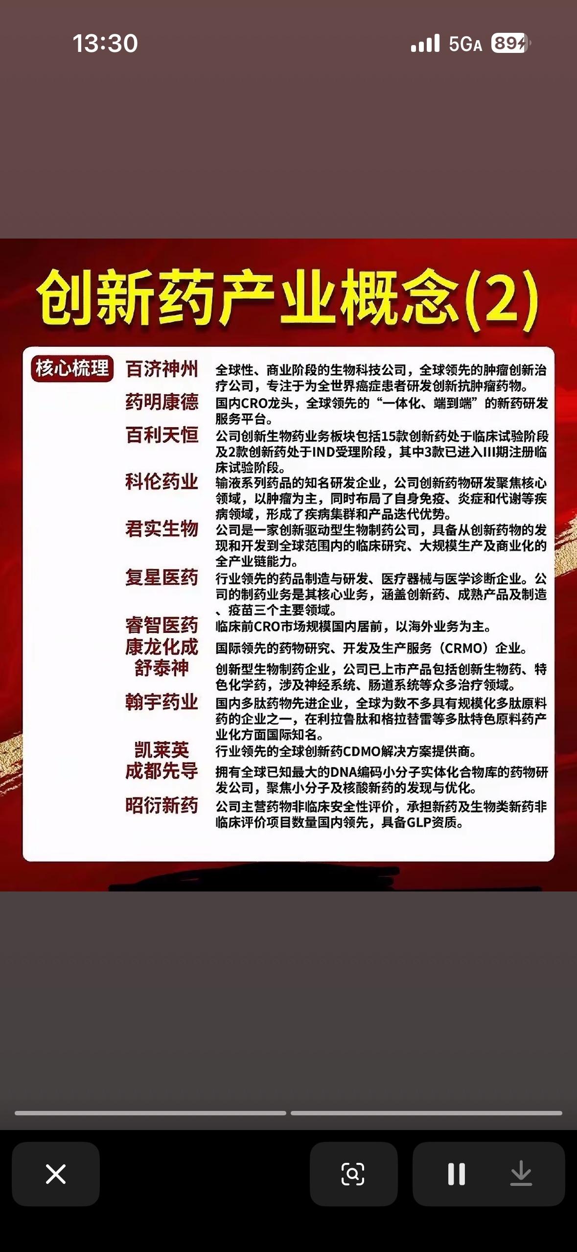 创新药核心概念股构成了一个非常完整的中国创新药产业投资图谱。它们不仅梳理了行业的核心逻辑,还详细拆解了细分赛道和代表性企业。 以下我为你深度拆解这背后的产业逻辑和投资关注点: 核心逻辑:从“仿制”走向“创新”与“出海” 这两张图的核心主线非常清晰:中国医药行业正在经历从低端仿制药向First-in-class(首创新药)和Best-in-class(同类最优)转型的过程。 - 图1(产业概念1)侧重于产业链分工和热门赛道(如减肥药、ADC)。 - 图2(产业概念2)侧重于核心资产梳理,解释了为什么这些公司是龙头。 重点赛道与公司深度解析 1. 创新药“出海”:真正的试金石 这是目前创新药最性感的逻辑。国内市场虽然大,但内卷严重,只有把药卖到美国或欧洲,才能打开天花板。 - PD-1/PD-L1(免疫治疗): 这是癌症治疗的基石药物。图中提到的君实生物(特瑞普利单抗)和百济神州(替雷利珠单抗)都已经成功在美国获批,这是中国药企实力的证明。 - ADC(抗体偶联药物): 被称为“生物导弹”,是目前全球最火的抗癌药赛道。中国企业在这一领域处于全球第一梯队。科伦药业(通过子公司科伦博泰)和百利天恒已经将自家ADC药物以几十亿甚至上百亿美元的价格授权给默沙东、BMS等国际巨头,这是典型的“借船出海”。 2. CXO(医药外包):卖水人角色 无论药企研发成功与否,CXO企业都能赚钱,因此被称为“卖水人”。 - 药明康德:绝对的龙头,提供从药物发现到生产的一条龙服务。虽然近期受地缘政治(如美国生物安全法案草案)影响波动较大,但其全球市占率和产能依然无法被替代。 - 康龙化成 & 泰格医药:前者擅长全流程服务,后者是临床CRO的老大(负责帮药企做人体临床试验)。 3. 减肥药(GLP-1):当下的流量密码 这是2023-2024年最火爆的概念。诺和诺德和礼来的减肥药在全球卖断货。 - 诺和诺德是丹麦公司,但中国的华东医药、恒瑞医药、信达生物(图中未列出但相关)都在紧锣密鼓地研发国产版GLP-1。 - 翰宇药业:主要做多肽原料药,处于减肥药产业链的上游,直接受益于全球减肥药产能的扩张。 核心龙头企业的“护城河” 结合两张图,我们可以给几个核心大佬画个像: 公司名称 核心标签 投资/关注逻辑 恒瑞医药 创新药一哥 转型最成功的传统药企,从仿制药巨头变成了创新药巨头,管线极其丰富,抗风险能力强。 百济神州 国际化先锋 研发投入巨大,拥有全球顶尖的血液瘤药物泽布替尼,是真正意义上具备全球竞争力的Biotech。 药明康德 行业基建 只要全球还在研发新药,就需要它的服务。虽然面临地缘政治风险,但基本面依然强劲。 科伦药业 ADC霸主 靠输液业务提供稳定现金流,靠子公司科伦博泰的ADC技术爆发增长潜力,是“大单品”逻辑的代表。 百利天恒 黑马 凭借一款双抗ADC药物(BL-B01D1)震惊全球,证明了中国的源头创新能力。 风险提示(深度思考) 虽然图中展示的都是机会,但在实际看待这个行业时,必须保持清醒: 1. 地缘政治风险:特别是对于药明康德、药明生物这类高度依赖海外营收(尤其是美国客户)的CXO企业,美国《生物安全法案》的进展是悬在头顶的达摩克利斯之剑。 2. 研发失败风险:创新药是“九死一生”的游戏。对于中小市值的Biotech(如图中列出的部分公司),一旦核心管线临床失败,股价可能会遭遇毁灭性打击。 3. 内卷与价格战:虽然都在谈创新,但部分热门靶点(如PD-1)在国内依然面临医保谈判降价的压力,利润空间被压缩。 总结: 这两张图是观察中国医药行业从“大”变“强”的缩影。如果你关注这个领域,“出海能力”(能不能赚美元)和“差异化创新”(是不是独家技术)是筛选这些公司的两个最重要标准。