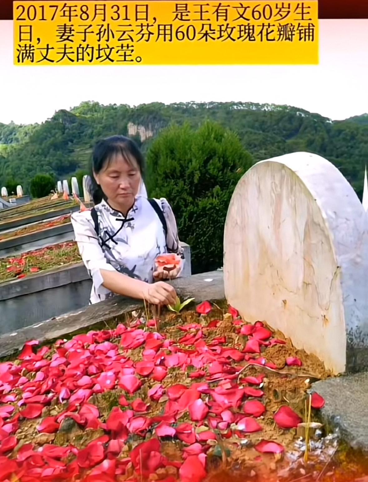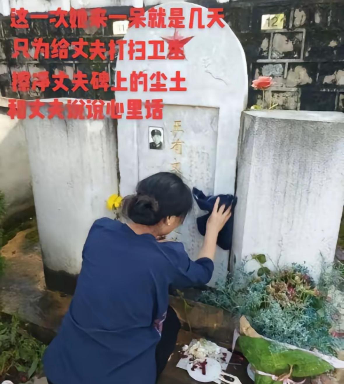 王有文,1957年生于河南省辉县人,他1979年参加对越自卫反击战,荣立战功,凯旋而归。1984年10月27日,作为昆明军区第一侦察大队5连连长王有文与排长孙飞龙,带领着侦察小分队在边境执行侦察巡逻任务时,当分队进入一条山涧时,遭到了越军的伏击,连长王有文立刻组织侦察队员向越军进行还击,不幸被地雷炸中,连长王有文下半身被完全炸碎,当场壮烈牺牲,年仅27岁。 5位战友中,除了一位侥幸生还外,其余4人全部壮烈牺牲。 这一年,孙云芬22岁,王连长才刚满27岁,与他只有19个月夫妻情的妻子,孩子刚满一岁。却用一生来守候,孙云芬只能将丧夫之痛深埋心底。 军嫂孙云芬,从千里之外的河南,来到边疆看望丈夫王有文烈士,就一个人呆呆的坐在丈夫墓前,悄悄的陪着丈夫说说心里话… 每次去陵园时,她总会准备一块毛巾,仔细地为爱人擦一擦墓碑,从头到脚擦几遍,将灰尘和污渍一点一点的除去。 烈士军嫂孙云芬终身不改嫁,在这40多年里侍候公婆到老…您为国尽忠,我替您尽孝。 致敬先烈!向伟大的军嫂敬礼!