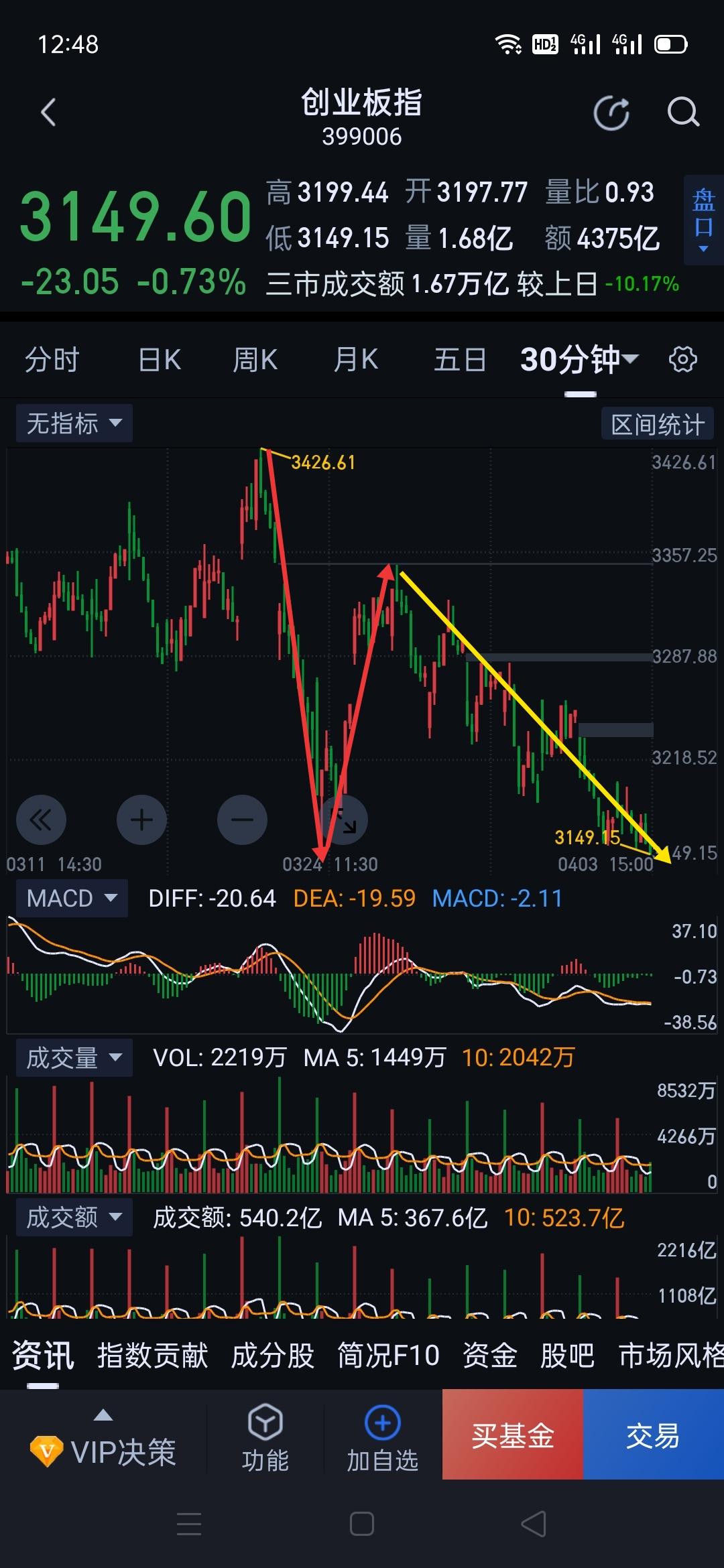 A股,仍处牛市初级阶段。 近期,伴随各大指数调整,牛市结束的声音也相应而生。牛市到底是已然结束还仅是上涨阶段的正常调整? 首先,政策面,管理层*牛市*的表述并未转向,维护资本市场稳定的政策风口依然清晰。 资金面,央行精心谋划、多措并举,用宽松的环境引导长钱、耐心资本的活水源源而来。 技术面,就创业板而言,目前处于第二个日线级别中枢(图1)构建中,(有可能形成九段升级的结构)。该中枢未有效破坏前,暂用中枢的震荡震荡的视角观察。若因外部因素影响,导致情绪波动,现在用“熊市” 思维应对还有些为时尚早。 下周,创业板暂可用三十分钟(图2)逐笔跟随。下周走势不外乎三种: 一,当下的三十分钟一笔下结束后,反弹不接触3155,后续以三十分钟向下线段的走势继续生长。 二,当下三十分钟下结束后,反弹回到3155~3347之间,形成五分钟中枢后,接着形成该中枢向下离开段,后期观察是否形成盘背。 三,当下三十分钟下结束后,向上形成有力度的反弹,后续若能回踩不创新低,则可期待新的日线向上结构产生。 市场投资,操作上要稳扎稳打,步步为营。不能让情绪扰乱了操作节奏。(图中黄色线段属于待完成走势)