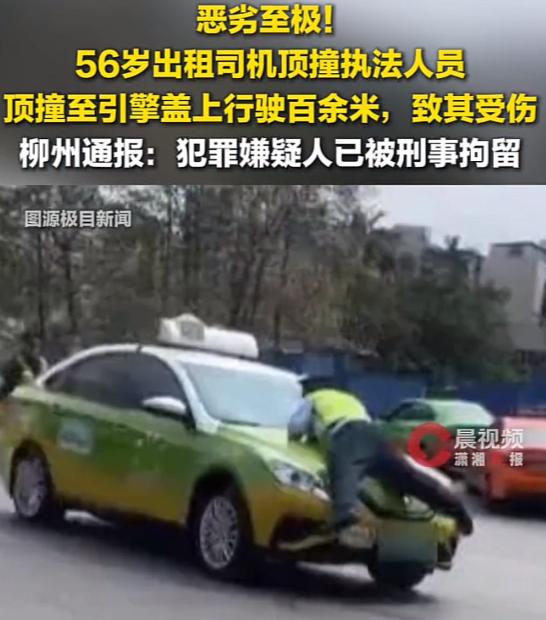 “牢底坐穿!”广西柳州,56岁男子驾驶一辆出租车,在执法人员例行检查的过程中,不仅拒绝配合检查,还一脚油门撞向执法人员至引擎盖上,行驶百余米才停车,造成该执法人员受伤。目前,男子已被刑事拘留,案件进一步调查中。网友:这是故意杀人! 广西柳州警方近期通报一起恶性事件,一名56岁出租车司机已被依法刑事拘留,等待他的将是法律的严惩。 谁也没想到,这名中年司机在面对执法人员例行检查时,不仅拒不配合,还一脚油门将执法人员撞至引擎盖上,拖拽行驶百余米,导致执法人员受伤,相关视频传开后,网友怒喊“这是故意杀人”,热议瞬间刷屏全网。 事发当天,柳州当地执法人员按照工作安排,在指定路段开展例行执法检查,主要排查出租车违规运营、证件不全等问题,保障道路通行秩序和市民出行安全,整个检查过程规范有序,全程有相关记录,并未出现违规执法的情况,也没有任何过激行为。 上午11时许,56岁的男子驾驶一辆黄绿相间的出租车,缓缓驶入执法检查区域。执法人员见状,上前示意其靠边停车,准备进行常规检查,可没想到,男子看到执法人员后,神色瞬间变得慌张,眼神躲闪,丝毫没有停车配合的意思,反而悄悄放慢车速,似乎在盘算着如何脱身。 执法人员耐心示意男子停车,告知其此次检查的目的的和相关流程,全程语气平和、态度规范,可男子依旧不为所动,反而悄悄挂挡、踩住油门,趁着执法人员靠近车身、示意其出示证件的瞬间,突然猛踩油门,车头直接撞向执法人员,将人狠狠顶在了引擎盖上。 周围的执法人员和路过群众都被这一幕惊呆了,有人急忙呼喊男子停车,提醒他此举会危及他人性命,可男子已经失去理智,不顾引擎盖上执法人员的安危,继续踩油门行驶,一路上车速时快时慢,拖拽着执法人员行驶了整整百余米,场面十分惊险,让人看得心惊胆战。 行驶过程中,引擎盖上的执法人员紧紧抓住车身边缘,身体随时可能被甩飞,身上多处被车身摩擦划伤,额头也被磕碰出红肿,疼痛难忍却不敢松手。 路过的车辆纷纷紧急避让,生怕发生二次事故,路人吓得纷纷驻足,有人赶紧拿出手机拍摄取证,还有人第一时间拨打了报警电话和急救电话,寻求警方和医护人员支援。 或许是迫于周围群众的大声劝阻和舆论压力,或许是意识到事情的严重性,男子行驶百余米后,终于缓缓停车。 执法人员见状,立即上前将其控制,防止其再次做出过激行为,此时被顶在引擎盖上的执法人员已经受伤,脸色苍白,浑身是伤,无法正常站立,随后被紧急送往医院救治。 民警赶到现场后,迅速开展调查取证工作,查看了现场监控和群众拍摄的视频,逐一核实事件的全过程,同时扣押了涉事出租车,提取相关证据。面对铁证,男子无法抵赖,如实交代了自己拒绝配合检查、冲撞执法人员的全部经过,没有任何辩解,神色十分懊悔。 据悉,被撞伤的执法人员经过详细检查,身上有多处软组织损伤,还有轻微的擦伤和磕碰伤,目前正在医院接受治疗,暂无生命危险,后续还需进一步观察休养。 涉事出租车已被警方依法扣押,男子因涉嫌妨害公务罪、故意伤害罪,已被警方刑事拘留,案件正在进一步调查侦办中,具体细节还在核实。 事件相关视频在网上传开后,迅速引发网友热议,评论区瞬间被刷屏,各类看法层出不穷。有网友怒不可遏,直言“这哪里是拒查,分明是故意杀人,太嚣张了,执法人员依法执法,他竟敢公然冲撞,必须重判”; 也有网友表示,不管司机有什么难处,都不能拿他人性命开玩笑,拖拽执法人员行驶百余米,已经涉嫌严重违法,绝不能轻饶。 对此,你们有什么看法,欢迎评论留言~