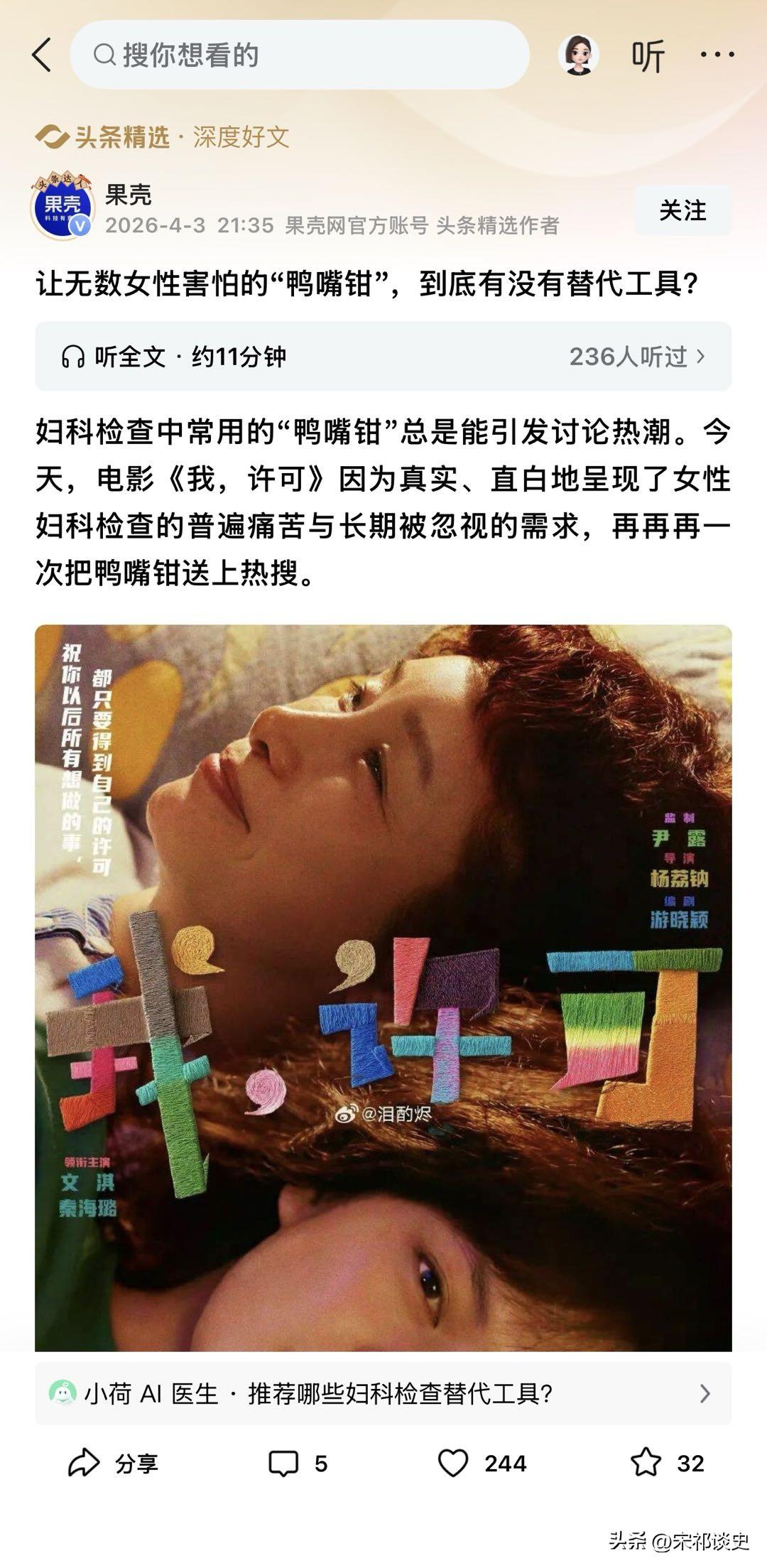 “当代女性刑具”!鸭嘴钳上热搜,为什么女性要忍受这种痛? 电影《我,许可》,再一次把妇科检查的“鸭嘴钳”送上热搜,无数女生怒喊:这根本就是当代女性刑具! 做一次检查,要提前做好心理建设,全程紧张到发抖,疼得冒冷汗,却没人真正重视我们的痛苦。 其实这东西学名叫阴道窥器,妇科检查离不开它,能帮医生看清阴道和宫颈,筛查宫颈癌、做采样,用处确实大。 但它带来的痛苦也是真的。 冰冷、僵硬,插入时的压迫感、疼痛感,甚至可能造成阴道损伤、出血,还有人因此留下心理阴影,再也不敢做妇科检查。 很多人疑惑,为啥不研发更友好的器械? 其实不是没试过:有给金属窥器包硅胶的,有改成充气式的,还有做成带摄像头、像卫生棉条一样的。 但要么推广不了,要么成本太高,要么有安全风险,至今没有能替代传统鸭嘴钳的产品。 给要做妇科检查的女生提个醒:提前问医生流程,主动说自己怕痛,要求用小尺寸窥器和润滑剂,放松肌肉能减轻不适。 希望未来能有更无痛、更友好的器械,让女生做妇科检查,不用再靠给自己打气硬扛!