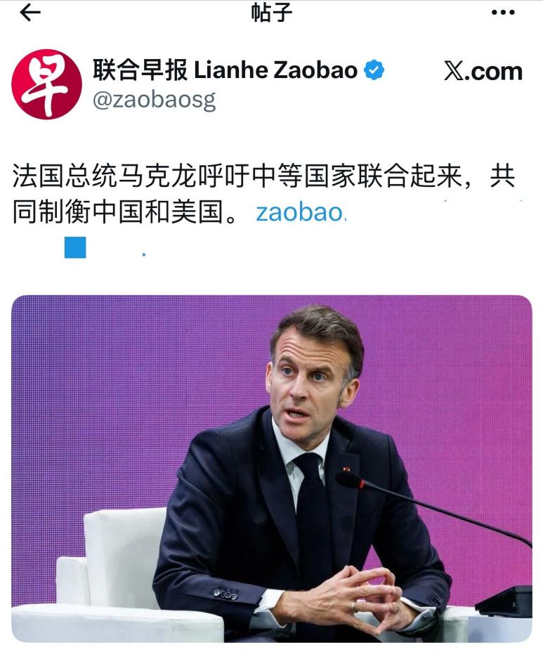 人在韩国,马克龙呼吁近50国联合起来,开辟第3条路线,共同制衡中国和美国! 新加坡《联合早报》4号报道说,马克龙访问韩国时在延世大学发表了讲话,呼吁“中等国家”联合起来,共同制衡中国和美国。结合俄罗斯《塔斯社》的消息,马克龙在演讲中是这么说的: “我认为我们的目标不是成为两个霸权国家的附庸。应该说,我们不想成为任何一个霸权国家的附庸。我们既不想依赖中国的主导地位,也不想过多地受制于美国的不可预测性。如果韩国、法国也认同这样的目标,并联合其他欧洲国家、加拿大、日本、印度、巴西、澳大利亚,我们就能开辟一条第三条道路。” 他的算盘是拉上韩国、法国,再加上其他欧洲国家、加拿大、日本、印度、巴西、澳大利亚,凑成近50国的“中等强国联盟”,一起开辟第三条路线。欧洲44个国家,再加上韩加日印巴澳6个,正好近50个,这账算得挺精。可问题是,这些国家真能拧成一股绳吗? 先看这些国家的基本盘。欧洲内部就不是铁板一块,德国跟法国的想法差得远,东欧国家更是把美国当靠山,生怕被俄罗斯“惦记”,怎么可能跟着法国疏远美国? 韩国和日本更不用说,美军基地就在家门口,安全上完全依赖美国,真要跟美国划清界限,他们敢吗? 印度倒是一直喊着不结盟,可跟俄罗斯关系又近,跟美国也眉来眼去,想让他站队,比让猫不吃鱼还难。 巴西和澳大利亚更是各有各的小九九,巴西要发展经济,离不开中国市场;澳大利亚前两年跟中国闹僵,现在正忙着修复关系,哪敢再蹚这浑水? 再说说实力差距。中美两国的GDP加起来占了全球近40%,军事力量更是甩其他国家几条街。法国经济总量还不到中国的五分之一,韩国连中国的十分之一都不到,就算近50个国家加起来,经济和军事实力跟中美比,还是不够看。 还有个关键问题,这些国家跟中美早就有千丝万缕的联系。欧洲国家跟美国是北约盟友,韩国和日本是美国在亚太的“铁杆小弟”,安全上完全依赖美国的保护; 而中国是很多国家的最大贸易伙伴,韩国2025年对华出口占总出口的25%以上,澳大利亚的铁矿石、巴西的大豆,都靠中国市场消化。 真要按马克龙说的“不依赖中国,不受制于美国”,这些国家的经济和安全都得打问号。 马克龙为啥这时候抛出这个想法?说到底还是欧洲的战略焦虑在作祟。 一方面,美国特朗普政府上台后,“美国优先”的政策让欧洲觉得被抛弃,马克龙之前就公开批评美国“不可预测”,说“你根本不知道他们明天会出什么牌,也不知道后天会不会突然变卦”。 另一方面,中国崛起让欧洲感到压力,既想跟中国做生意,又怕被中国“主导”。这种左右为难的心态,让马克龙想找条“中间路”。 可这条路哪有那么好走?法国自己的实力就撑不起这么大的野心。2025年法国GDP约3.1万亿美元,军费开支不到600亿美元,连美国的十分之一都不到。 想领导近50个国家跟中美叫板,有点自不量力。而且欧洲内部矛盾重重,德国、英国、意大利各有各的算盘,马克龙连欧洲都团结不了,还想团结全球近50国,简直是天方夜谭。 再看看这些国家的反应。韩国总统李在明虽然跟马克龙签了11项合作备忘录,把双边关系提升到“全球战略伙伴关系”,但对“第三条道路”的提法避而不谈。 日本首相高市早苗更是直接表态,日美同盟是日本外交的基石,不会动摇。印度和巴西也只是口头应付,没任何实际行动。这些国家心里都清楚,跟中美搞对抗,最后吃亏的肯定是自己。 还有个更现实的问题,马克龙说的“制衡”,到底想怎么操作?是在经济上跟中美脱钩,还是在军事上搞对抗?经济上脱钩,这些国家的产业链都会受重创;军事上对抗,更是想都不敢想。 中美两国的军事实力摆在那,真要打起来,这些国家连自保都难。马克龙的想法,更像是一种外交姿态,而不是真正的战略规划。 其实马克龙的“第三条道路”,跟以前的“不结盟运动”有点像,但时代早就变了。冷战时期,不结盟运动还能在美苏之间找平衡,现在中美博弈的格局完全不同,全球化让各国利益深度捆绑,想彻底跟中美切割,根本不可能。 韩国的半导体、法国的核能、德国的汽车,都离不开中国市场;欧洲的安全、日本的防务,也离不开美国的保护。这种相互依存的关系,不是马克龙一句话就能改变的。 说到底,马克龙的“第三条道路”更像是一种政治口号,用来彰显法国的国际地位,缓解欧洲的战略焦虑。真要落实,连第一步都迈不出去。 这些国家嘴上可能会附和,但真要付出实际行动,一个个都会往后缩。毕竟在大国博弈的棋局里,中小国家的生存之道从来不是跟大国对抗,而是在大国之间找平衡,实现自身利益最大化。