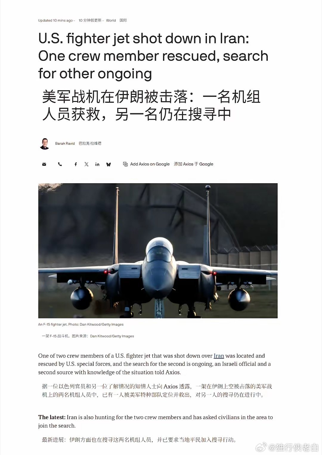 在过去24小时内,美国空军损失惨重:1架F-15E战斗机被击落1架A-10C攻击机被击落2架HH-60W战斗搜救直升机被击中1架F-16CJ战斗机发出7700紧急代码1架KC-135R加油机发出7700紧急代码葫芦娃救爷爷,最后搭上了一堆。