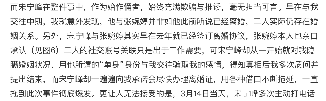 曝宋宁峰张婉婷去年已签订离婚协议 Q女士曝与张婉婷聊天记录,张婉婷说去年春节没和宋宁峰一起过,是因为两人已经签订离婚协议。