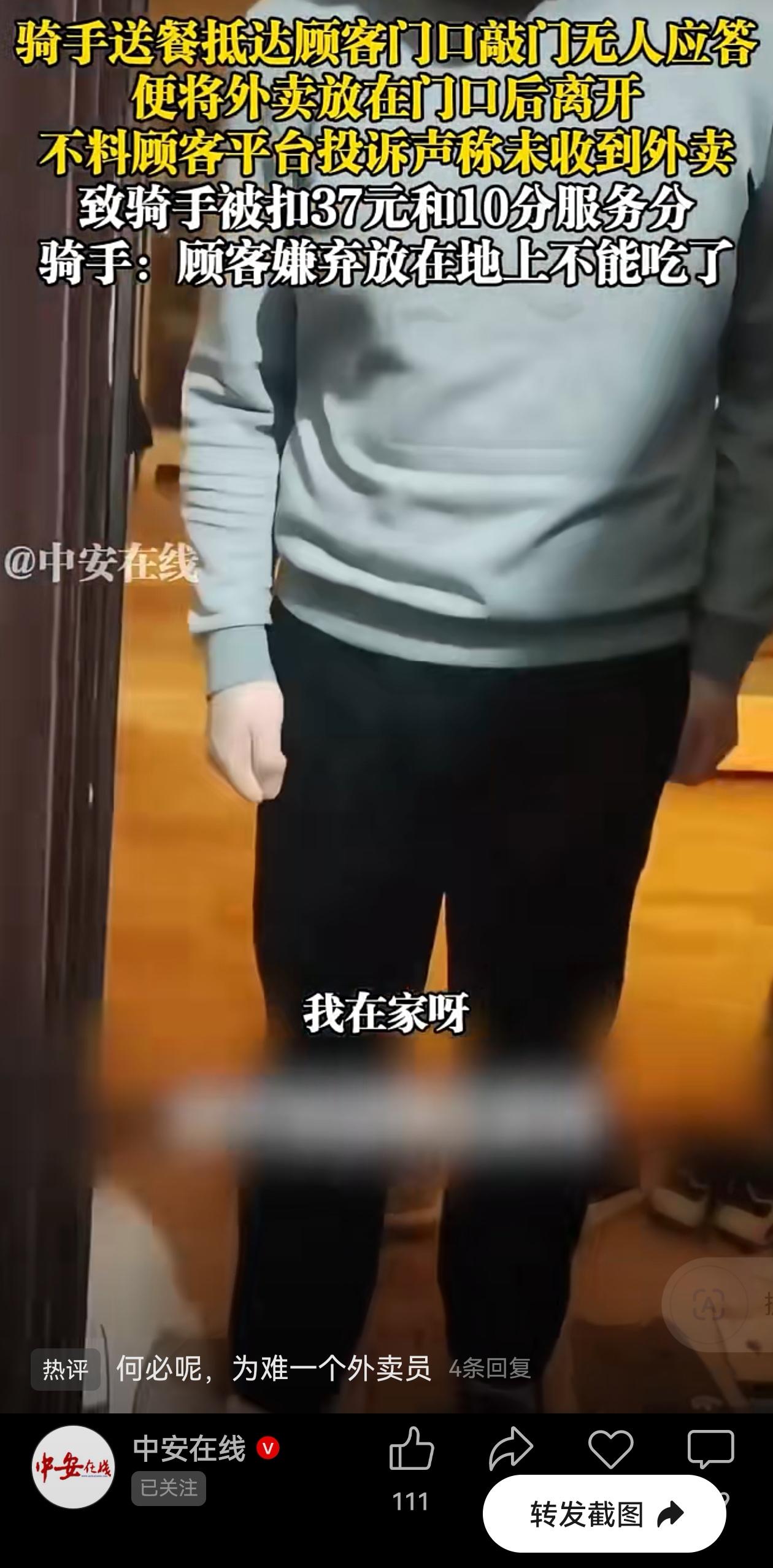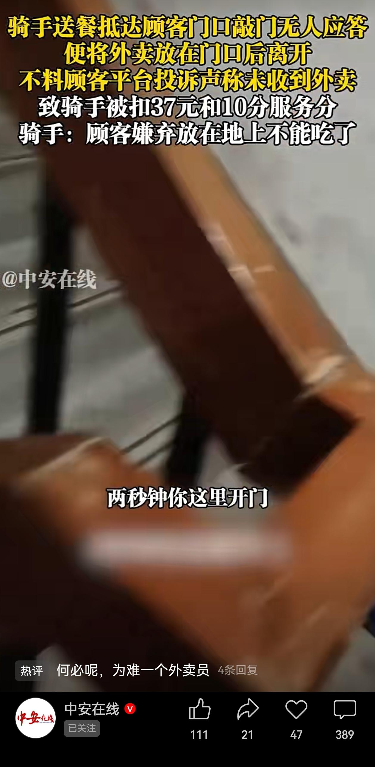 “急”遇到了“刁”啊!4月3日,上海一个外卖骑手送餐到顾客家门口,敲门后无人应答,就将外卖放在门口后离开了。 随后顾客却以未收到外卖为由在平台投诉,骑手因此被罚款37元并扣除10分服务分。 骑手表示非常委屈,到顾客家门口,看到顾客的外卖好好的放在门口,实际是嫌弃外卖被放在地上不卫生,才故意投诉。 顾客开门表示,你敲了门才2秒钟我就来开了门,但是已经看不到外卖员了,看到外面的外卖放在地上,没交到自己手上,所以投诉说自己没收到。 都知道外卖小哥急,是真急。一单超时扣几块,一天上百单,跑慢了全白干。所以他敲门两秒没人应,转身就走,赶紧下一单。这背后是平台的算法在抽鞭子,不全是他的错吧?一般人都会理解。 但这次他踢到铁板了!遇到了位“刁”的!外卖明明到门口了,就因为没亲自递到自己手上,就说“未收到”? 敲门两秒就走,确实太“急”了点;嫌放地上脏,可以理解,但直接投诉罚人家37块钱,有这必要吗? 这事儿就是“急”和“刁”碰一块儿了。骑手急那两秒钟,少了一份责任心;顾客随意投诉,多了一份刻薄劲儿。 说到底,这事儿差的就是那点耐心和善意。骑手多等十秒,喊一嗓子“外卖放门口啦”,顾客心里有数;顾客拿餐时体谅一句“师傅下次别放地上”,非要搞成投诉大战?两句话的事儿,非要搞成罚款、扣分?一个急得丢了规矩,一个刁得失了点善良。 但是话说回来,这事儿平台处理得也太简单粗暴了点吧! 顾客明明拿到餐了,却说“没收到”,这明摆着是恶意投诉。骑手只等两秒确实不对,但平台连问都不问,直接罚骑手37块钱、扣10分? 这就好比老师看见俩孩子打架,不分青红皂白只罚一个,那另一个下次还告黑状。 顾客撒谎投诉,明明外卖到了却说没收到,可现在倒好,平台为了省事,一刀切全怪骑手,这不是逼得老实人委屈,刁钻的顾客得意吗? 平台处理这种纠纷肯定不少,能别光听顾客一面之词就罚骑手吗?先看证据:照片、定位、通话记录,骑手到底等了几秒、打没打电话,一查就明。 如果骑手确实等了两秒就走,扣他几分、提醒一下应该;如果顾客明明拿到餐却说“没收到”,投诉能好好解释吗?这样骑手心服,顾客也不敢乱来。 说白了,平台要当个聪明的调解人,不是冷血的判官。查清楚、分对错、各担其责,哪还有这么多矛盾呢? 信息来源:中安在线