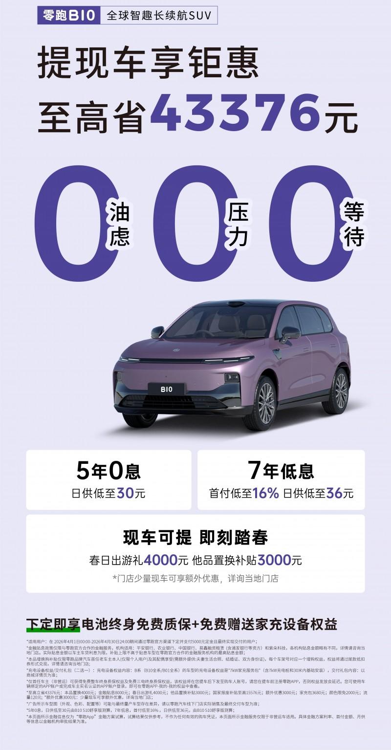 零跑B10这波政策太狠了?4月优惠直省上万,刚需家庭可以出手了! 刚拿到零跑B10的4月最新政策,说实话,看到这个力度我第一反应是:零跑这是要在15万内的SUV市场“搞事情”啊! 先说重点:4月1日-30日下定,直接省出一部新手机的钱。 4000元金融补贴(下定后直接抵扣尾款),再加上最高8000元的增换购补贴(本品增换购专享),光这两项加起来就1.2万了。如果是他品置换,也能拿到3000元补贴。而且现在下定,还限时送价值2000元的充电设备权益或者交付礼包,二选一,怎么算都不亏。 更关键的是——现车交付,不用等! 对于刚需家庭来说,这可能是B10上市以来最实在的一波政策了。而且零跑这次在金融方案上也给了低首付和低利息的选择,具体可以问问门店,我了解到的信息是购车门槛确实降了不少。 为什么说B10值得在这个节点入手? 简单说几个核心点你就明白了:600km级续航、180°放平前排座椅能变“大床房”、副驾那个可以DIY的魔术拓展坞(放个折叠桌、手机支架啥的特别实用),还有同级别少有的激光雷达+8650芯片+8295座舱芯片这套组合。 说人话就是:这车开起来顺手、坐着舒服、智能配置也不掉队,关键是用车成本低——首任车主终身免费整车质保(含三电),2年免费车机流量(4G/月),基础流量终身免费。 给纠结的朋友一个建议: 如果你预算在15万以内,想要一台空间大、续航扎实、智能化配置到位的纯电SUV,B10确实是目前这个价位里很有竞争力的选择。4月这波政策叠加下来,性价比更突出了。 唯一要提醒的是:政策截止到4月30日24:00,定金5000元锁定权益。建议周末去门店实际体验一下,尤其是那个后排空间和全景天幕,坐进去才知道什么叫“87.4%得房率”。