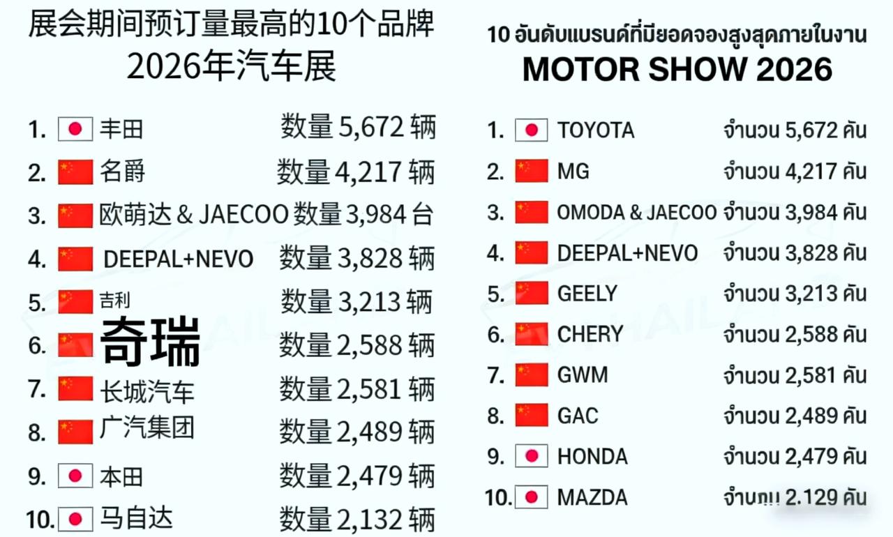 从数据看日本汽车在东南亚尤其泰国的快速萎缩。 图是刚刚3月底的曼谷车展的统计数据,但没有看到比亚迪,是没有参展吗。但比亚迪现在是中国品牌在泰国的绝对老大。 仅仅三年,日系在泰国占有率,就从之前近90%的绝对垄断下滑到2025年全年大概68%,而中国品牌从那时候大概3%跳涨到去年的22%。 几年前,我说中国车一定有优势快速进展,但也没想到这么快。 今年中国品牌的数据只会更加迅猛增长。感谢丑国和犹大。并且这个趋势不会随着之后海湾战争的结束而结束了,世界能源格局彻底要改变了,打醒了很多国家。 他们会向中国学习,也会向中国购买或引进大量新能源产业的工业品,从上游到下游。前些天泰国总理不就示范性的自购换了一辆泰国制造的比亚迪海狮07。 表格里第3个其实是奇瑞的车,第4个是长安的深蓝和启源。 日系如果安慰自己,会说你用你的纯电和增混打我的混动,但我还有燃油拥趸。但中国人说那不行,我把混动拿过去也卖和你油车一样价格看你怎么招架。长安刚刚推的蓝鲸超擎混动比传统油车省油很多,动力也强很多,丰田怎么招架。 所有路都给日本品牌堵死。2026年底,数据只会更变天。 说到天,东南亚那边太阳天也多,将来中国人再把光伏板装上车顶,一台大车每天发4到5度电,跑20公里左右。或者房顶光伏发电,储能充电,电动车,这一套下来一户人家就能源自循环了,还需要海湾的油吗,还买传统油车吗。 最近连摩托车也在给日系断后路。那中国的燃油摩托车会重返东南亚吗。可能也难了,中国电驴和电动摩托的综合省钱优势太吸引人。 以前去泰国旅游,就到处找中国的手机,家电,汽车的广告。以后有机会再去,估计那时候满大街都会看到很多中国车了。 就这么安安静静的,岁月不留痕的把日本最后不多的产业龙头按下去闷杀在水缸里。还是那个判断,不远的将来,日本本土的产业只会剩下风俗业和旅游业。