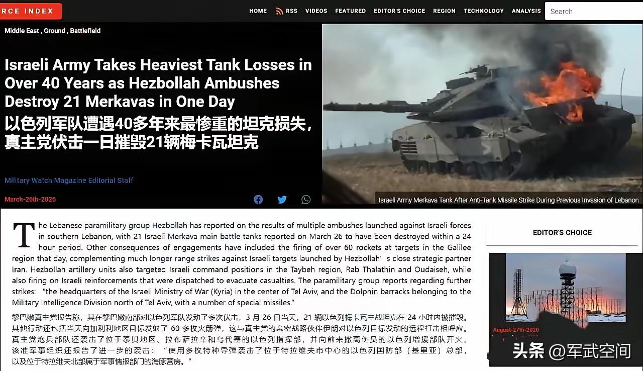 以色列单日损失21辆梅卡瓦主战坦克。 援引央视报道,以色列军队3月26日坦克损失21辆,打破了自1982年以来,单日坦克最大战损记录。黎巴嫩真主党装备有无人机以及先进的反坦克导弹,这是哈马斯武装力量不能比拟的。 据网络消息显示,自以色列武装对黎巴嫩执行地面打击任务的12天内,共计134辆“梅卡瓦”主战坦克被击毁,几乎每天都有近10辆以色列坦克被炸。