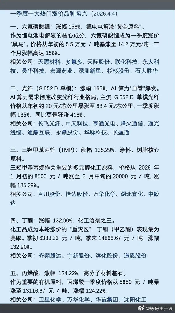 十大产品涨价概念!1.六氟磷酸锂2.光纤3.甲基丙烷TMP4.丁酮5.丙烯酸6.
