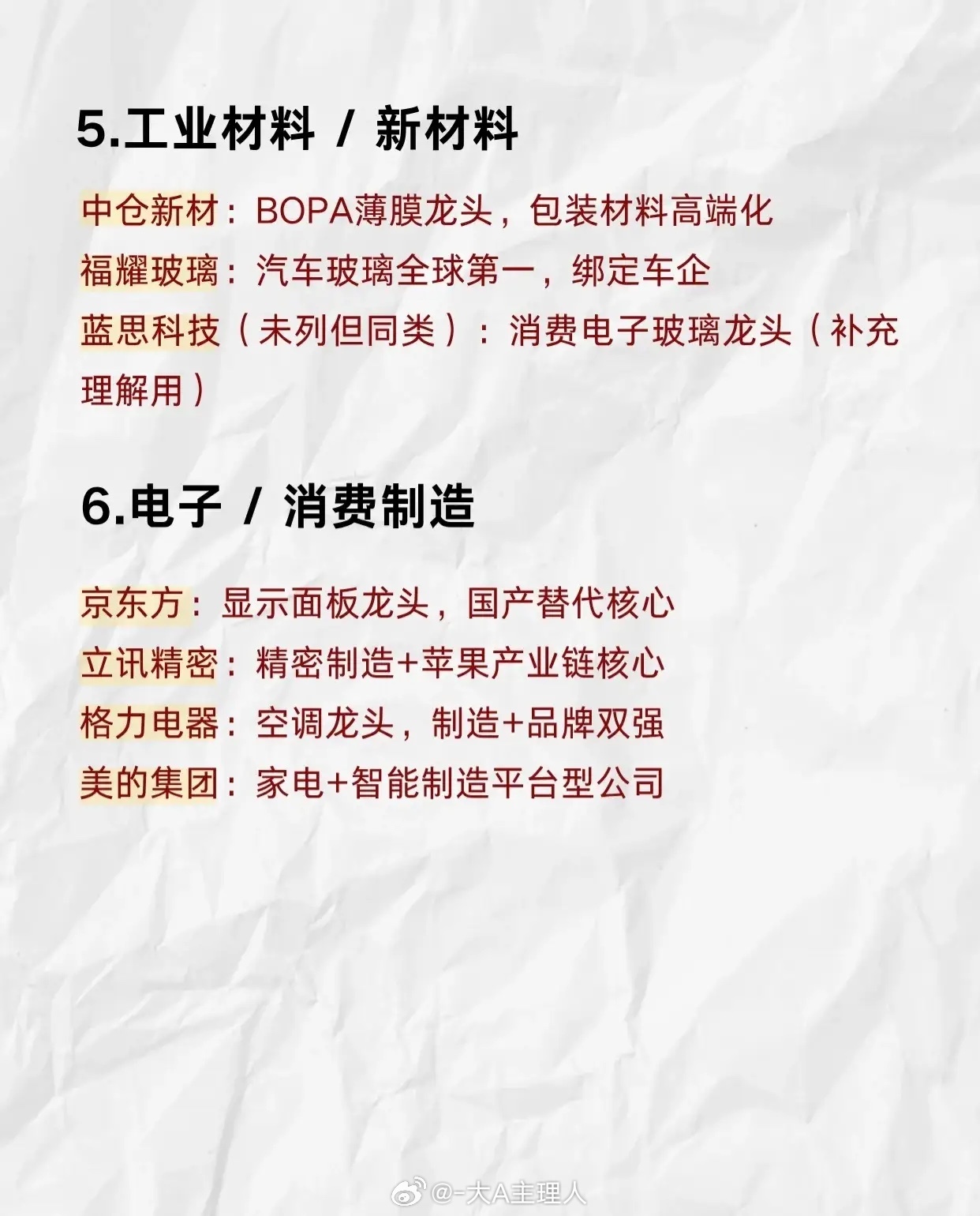 - 京东方:显示面板龙头,国产替代核心力量- 立讯精密:精密制造+苹果产业链核心供应商- 格力电器:空调行业龙头,制造+品牌双强格局- 美的集团:家电+智能制造平台型企业