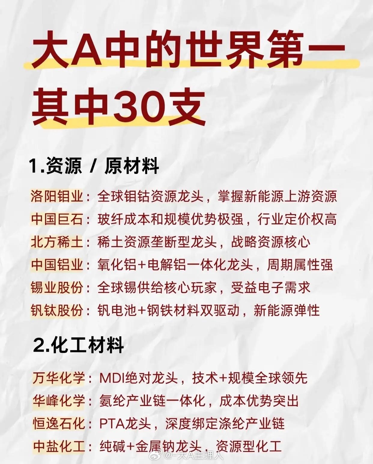 A股中的“世界第一”企业(精选30家)1. 资源/原材料领域- 洛阳钼业:全球钼