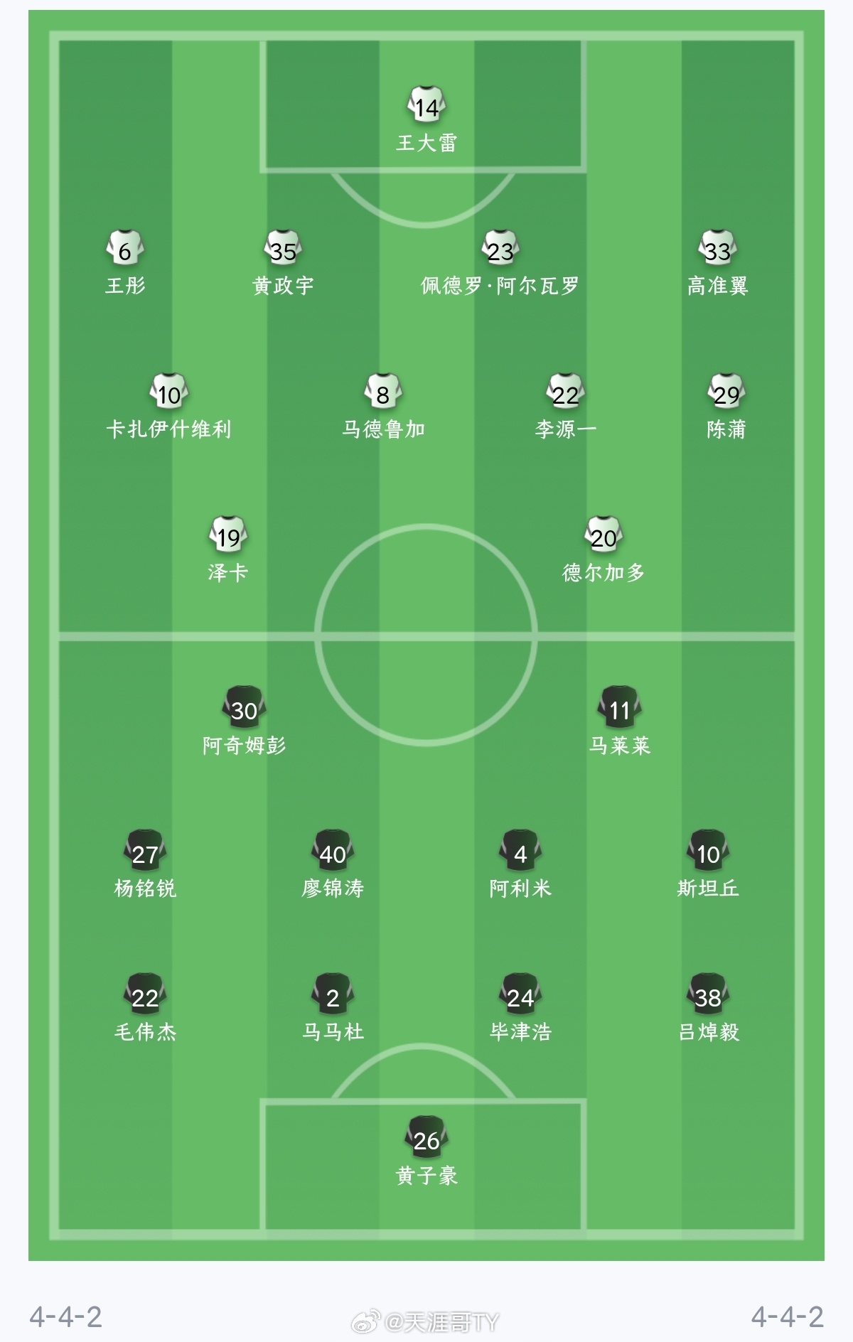 卡扎伊什维利/泽卡/马德鲁加/佩德罗·阿尔瓦罗/李源一/陈蒲/黄政宇/高准翼/王彤/德尔加多/王大雷首发。克雷桑没进大名单?什么情况兄弟们?山东泰山
