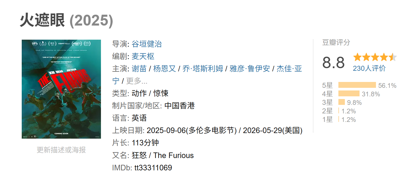 谢苗的《火遮眼》炸裂,评分高达8.8分,要知道李连杰的《精武英雄》也才8.7分。