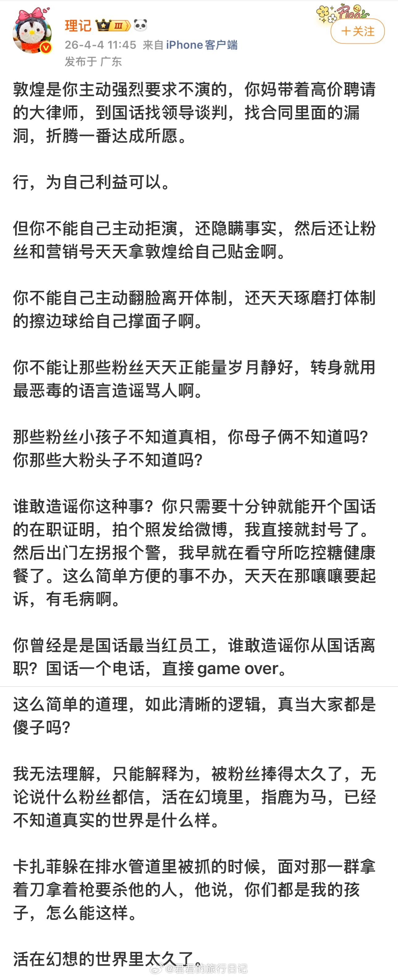 理记继续揭露张艺兴:他入职国话后,不想演敦煌话剧。他妈带着律师,翻出他和国话签约的合同,翻来覆去找漏洞,终于如愿以偿不演了。