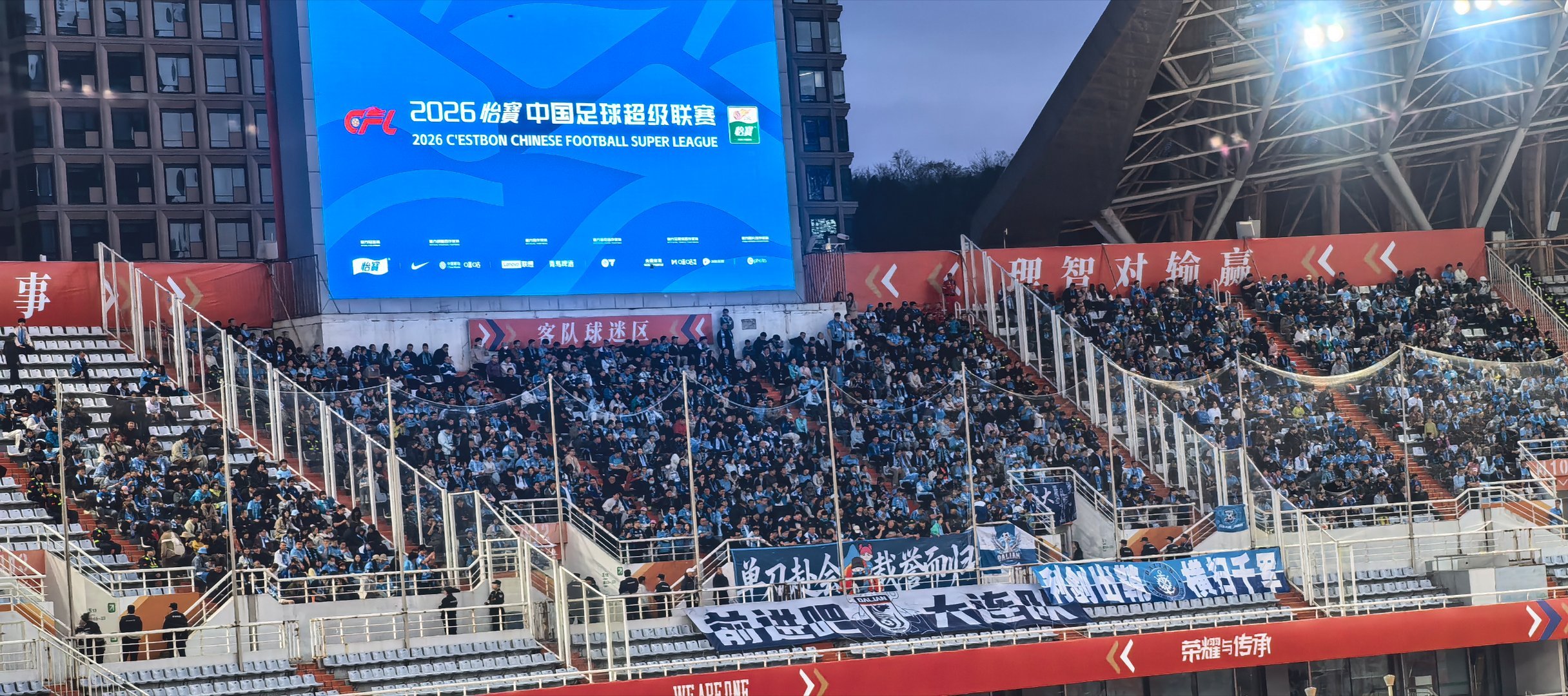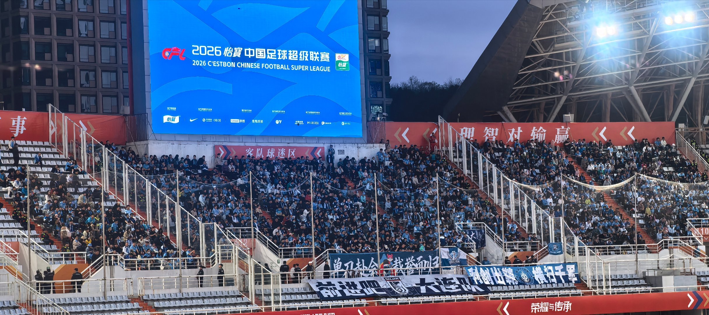 1500+的大连球迷在客队区就位,欢迎大家来济南奥体观赛山东泰山vs大连英博2026中超联赛
