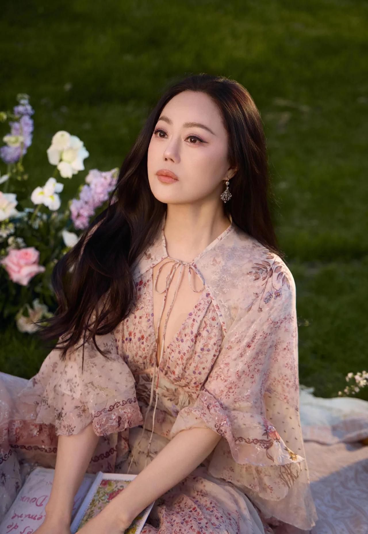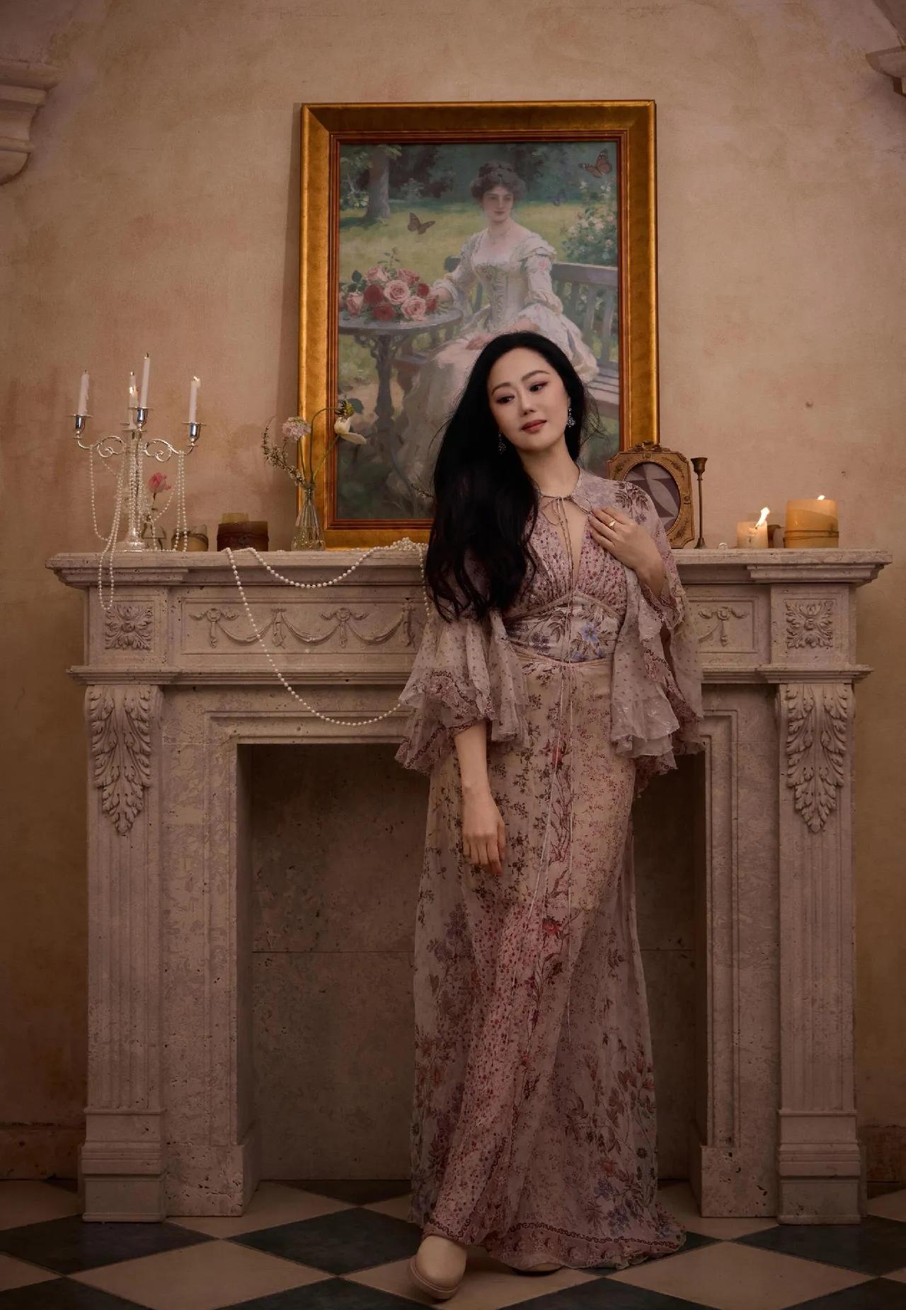 章小蕙才是碎花裙的正确打开方式! 烟粉碎花长裙+黑长卷发,复古又贵气,完全不土气