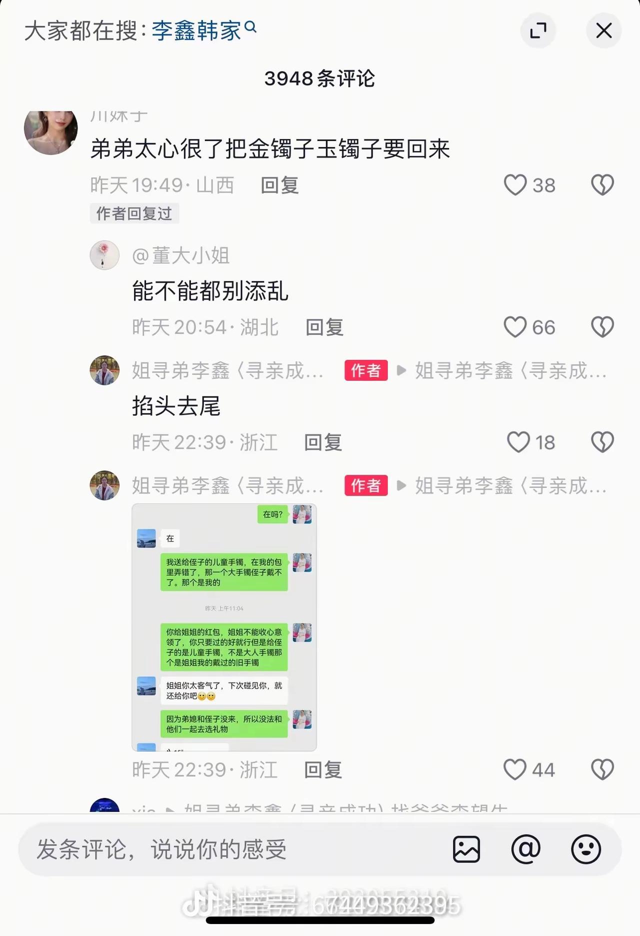 看得出来这次李林生气了,强硬地说李鑫的根在湖北! 起因是李林觉得是养家在网上发出她和弟弟掐头去尾的聊天截图,因为李鑫当时回韩家,李林让李鑫给侄子带的礼物给错了,还记得当时李鑫发视频,网友就说这怎么像大人的,后来李林让弟弟寄回去,然后把侄子的手镯换回来,引出来的乌龙! 一些网友看到截图说,姐姐这语气确实太强硬了,弟弟看了难受! 李林在网上说,弟弟平时连聊天软件都不是很熟练,怎么可能发在网上的视频做得那么好,认为韩家找团队控制了弟弟的账号,伤了姐弟的和气。 李鑫说,这个账号是他和媳妇在做,让姐姐相信他有明辨是非的能力! 清官难断家务事,感觉这姐弟私下不能沟通吗,什么事都拿在网上说,姐姐用几十年找到了弟弟,看到弟弟生活幸福也就安心生活,而弟弟也不要在网上发掐头去尾的截图,这样确实伤姐姐的心。