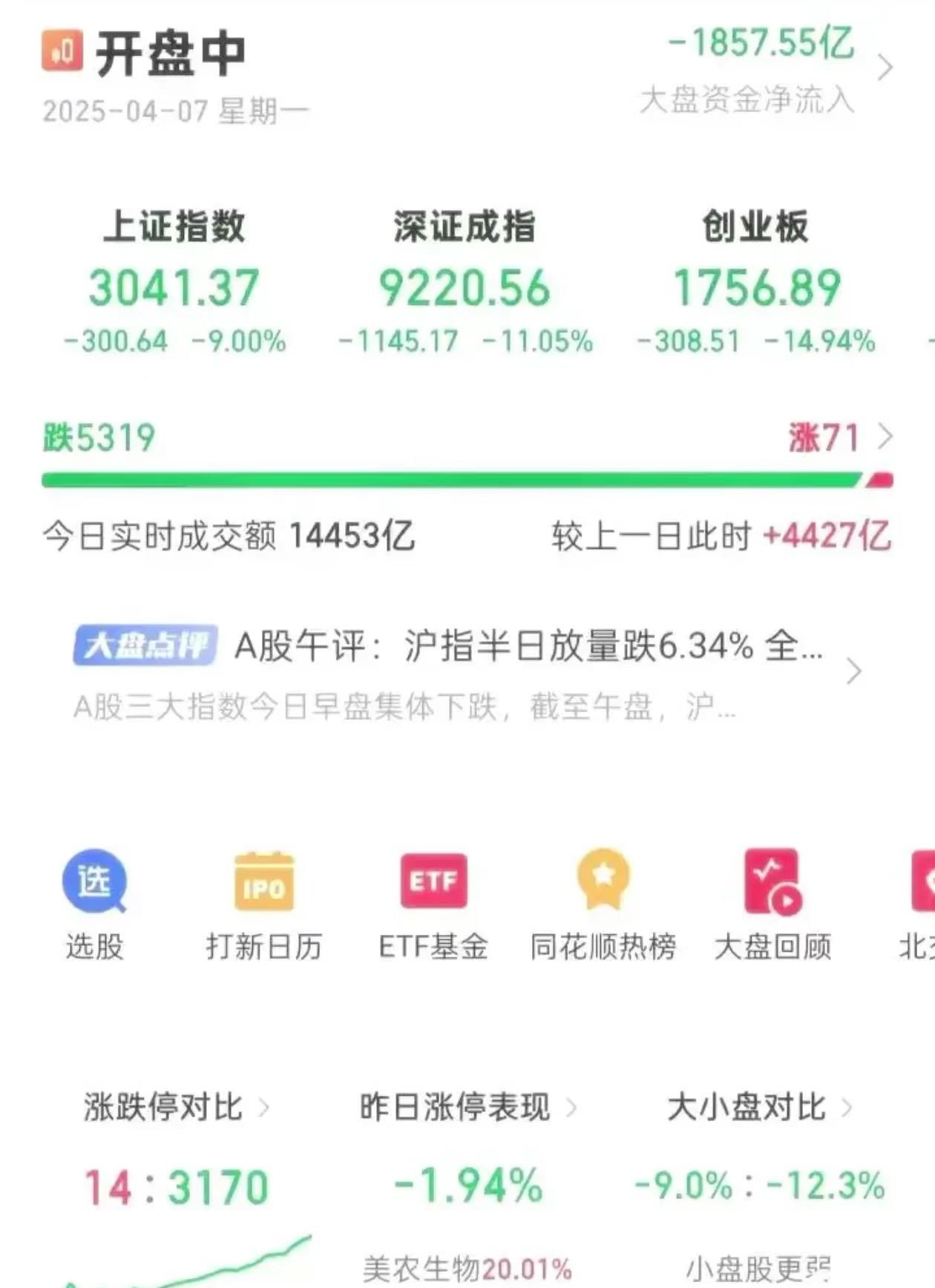 26.4.4去年4月7的拐点 很多人都在大喊 行情差亏麻了! 可能都忘记了吧! 去年4月7日多惨烈 最近大盘是很差 但是都有预期 包括战争黑天鹅 这两个月 百骨跌停才一次 然后各种谣言恐慌 我说你们没经过去年 4月7日吗? 千骨跌停 盘中最高大盘跌9点起步 收盘跌7点 这不也是去年的拐点吗? 当然恐慌害怕的任何时候都可以出局 我只是想告诉大家 3月都不算极端行情 好好休息吧周末 别自己吓自己