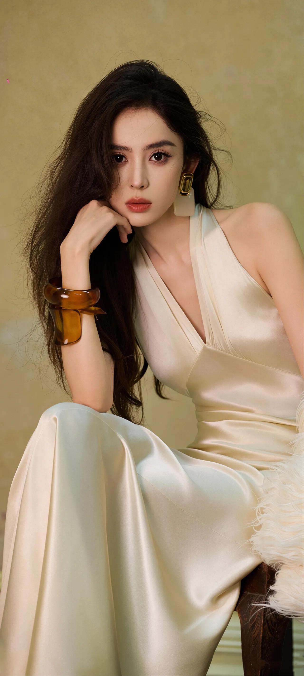 美女壁纸~古力娜扎一袭挂脖露背长裙,鎏金缎面裹着曼妙身姿,复古耳饰点亮慵懒风情,