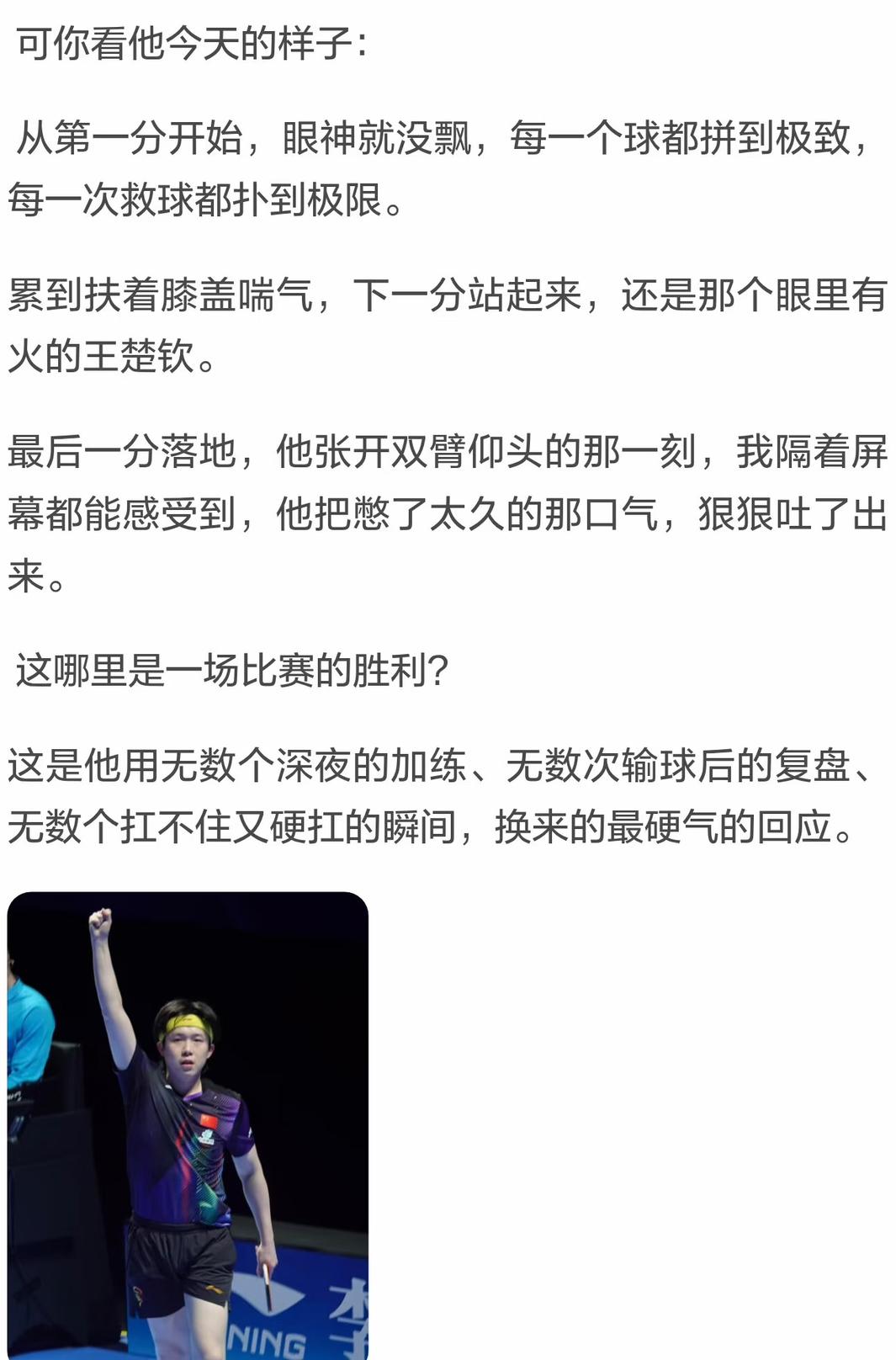 太惊险啦,王楚钦4:3达科 完成史诗级逆转,晋级世界杯男单4强,王皓指导紧张的坐立难安! 4月4日澳门世界杯男单1/4决赛, 王楚钦4:3达科,晋级半决赛! 11:4,9:11,7:11,9:11,12:10, 11:6,11:8 王楚钦今天迅速进入状态, 把自己的状态调整到最佳, 11:4轻松拿下第一局! 第二局王楚钦7:4领先,达科在 慢慢适应王楚钦的发球,比分追平 9:9,关键球达科反手变直线, 11:9扳回一局! 第三局达科5:2领先,王楚钦 稳住心态,追分至7:7平, 达科两个擦网,一个擦边, 王楚钦没法了7:11再输一局! 关键是第四局,达科的刀削面发球, 王楚钦接失误好几个9:11王楚钦 再丢一局! 情况太糟糕了,王楚钦大比分 1:3达科,按说达科比小布好打啊…… 关键的第五局,王楚钦的生死局, 2:3落后一分,王皓指导暂停, 王楚钦说这个球总拉漏啦, 王楚钦撕下肌贴的那一刻, 太心疼他了,王楚钦太想赢, 太拼啦,压力太大,进入8强后, 就剩他自己,6:7达科又一个 擦网,6:8,6:9,王楚钦在关键时刻 没有放弃,比分追平到9:9, 10:9,10:10,12:10王楚钦绝处逢生,逆转比分,有了缓口气的机会! 大比分王楚钦2:3啦! 第六局,王楚钦6:2领先,最难的时候过去啦,重新确定了自己前三板的优势,11:6追平大比分3:3平啦! 决胜局达科的心态崩了, 王楚钦的气势恢弘,5:1领先,7:2, 11:8王楚钦完成史诗级逆转, 晋级男单半决赛! 恭喜王楚钦晋级男单半决赛, 下一场比赛将对阵雨果与大布 的胜出者,王楚钦继续加油👏, 预测一下, 王楚钦半决赛将对阵雨果, 下半区男单半决赛, 林昀儒VS松岛辉空, 加油国乒!