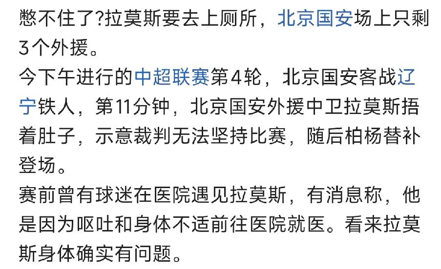 北京国安队外援伤的真夺怪! 中超联赛第四轮,北京国安队来自德甲汉堡队的外援后卫拉莫斯,开局十分钟就因脚踝扭伤下场。 更有球迷调侃:憋不住了?拉莫斯要去上厕所,北京国安场上只剩3个外援,见图三! 另外,北京国安队的中场核心达万,有痔疮,担心北京的医疗水平,特意飞回巴西手术,结果术后感染,缺席多场中超比赛…… 达万、拉莫斯离奇伤缺,对北京国安队争夺本赛季联赛冠军的影响非常的大! 希望北京国安俱乐部在管理外援方面,还是要更职业一些! 北京国安