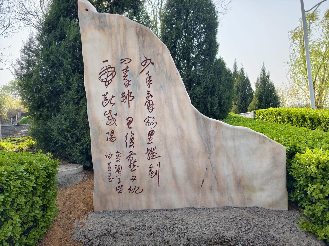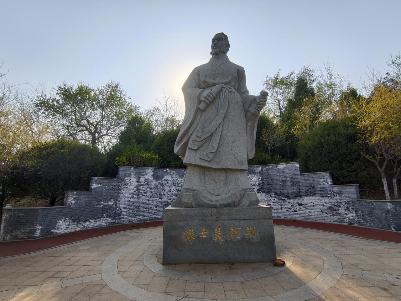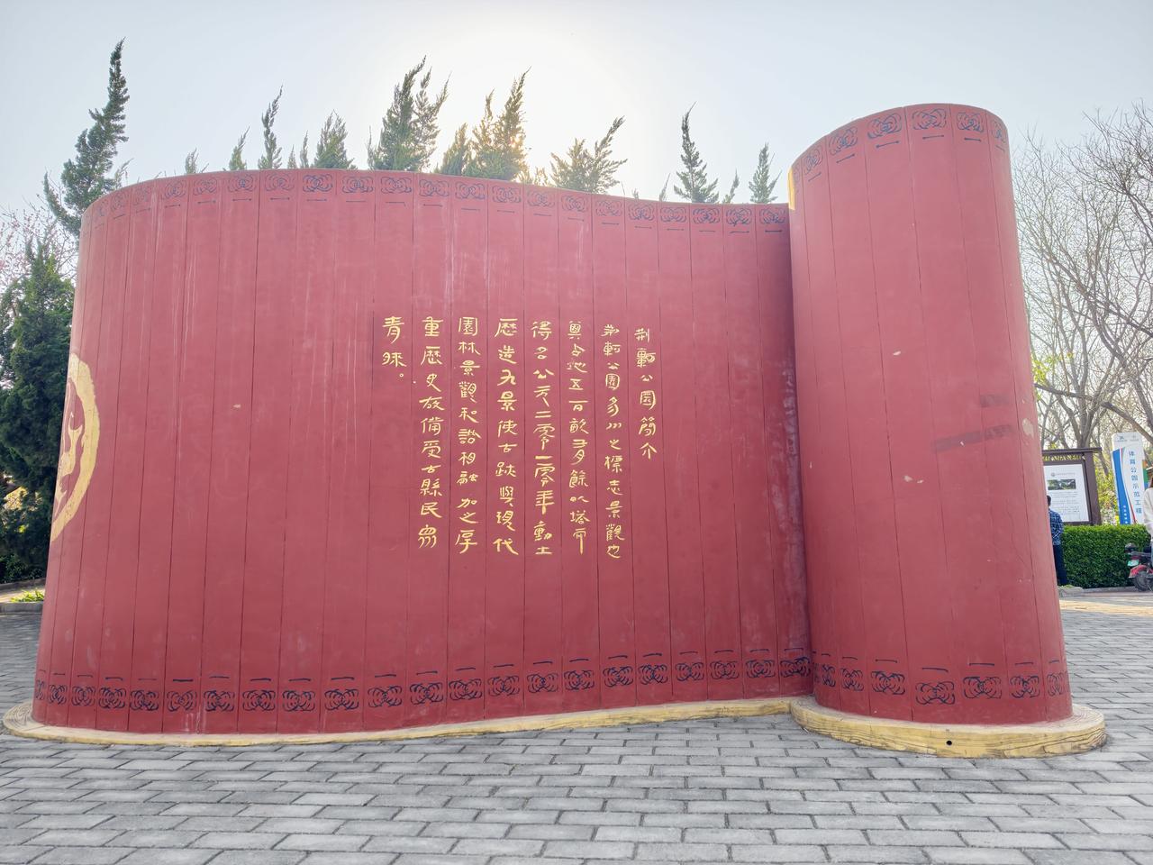 清明易县(2)荆轲公园: 进入公园大门,高高的台阶上,先是矗立着一尊巨大的红色书简,再往上走就是“壮士一去不复还”的荆轲雕像了!!