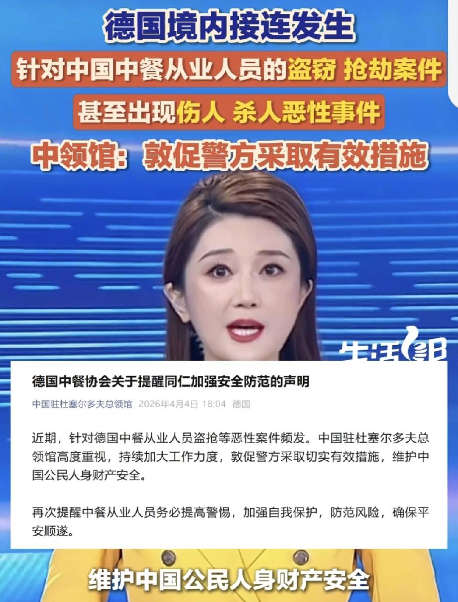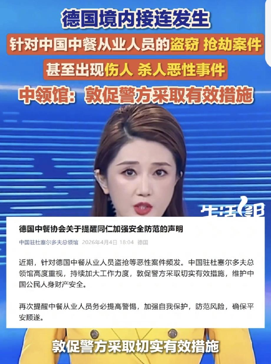 针对德国中餐从业人员盗抢等案件频发 最近德国针对中餐从业人员盗抢等恶性案件频发,太让人揪心了。中国驻杜塞尔多夫总领馆很重视,一直在敦促警方保障中国公民安全。 德国中餐协会也发布声明,谴责这些恶性事件,还给出安全提醒。比如要妥善保管现金,店里别留现金,装个符合要求的保险柜;夜间和打烊时段提高警惕;处理好劳资关系;加强监控和警报;别单人长时间值守。 在异国他乡打拼不容易,希望中餐从业者都能提高安全意识,保护好自己的人身和财产安全。也希望德国警方能尽快采取有效措施,遏制这类案件的发生。