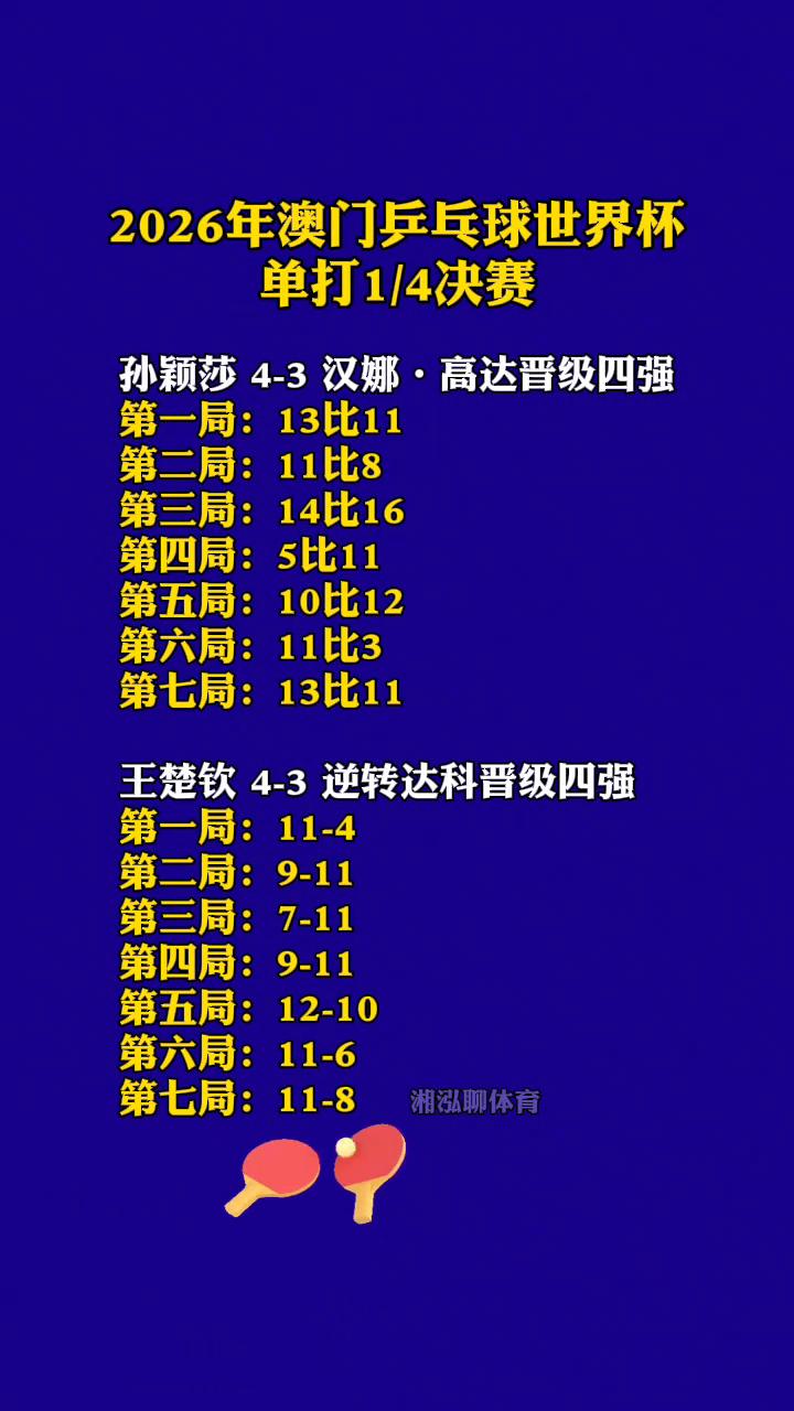 2026年澳门乒乓球世界杯单打1/4决赛,孙颖莎4-3汉娜·高达晋级四强。