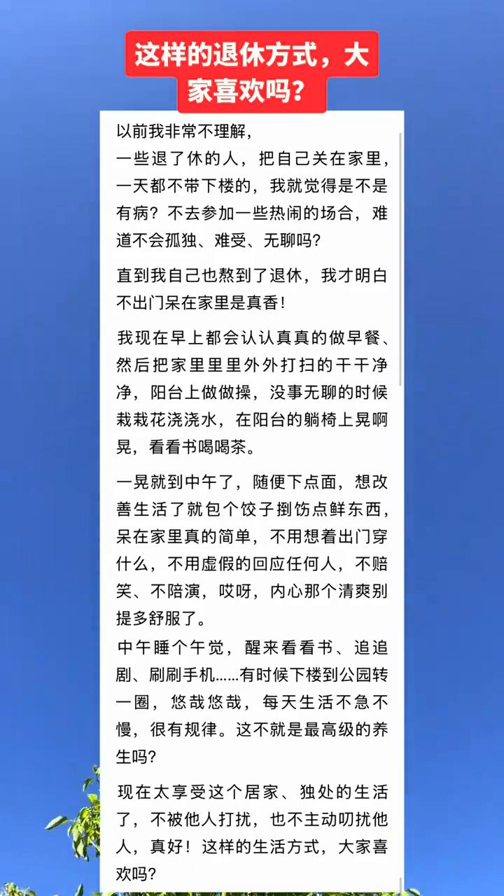 这样的退休方式大家喜欢吗? 以前我非常不理解一些退了休的人把自己关在家里一天都不带下楼的,我就觉得是不是有病?不去参加一些热闹的场合难道不会孤独、难受、无聊吗?直到我自己也熬到了退休,我才明白不出门呆在家里是真香! 我现在早上都会认认真真的做早餐,然后把家里里里外外打扫的干干净净,阳台上做做操,没事无聊的时候栽栽花浇浇水,在阳台的躺椅上晃啊晃,看看书喝喝茶。一晃就到中午了,随便下点面,想改善生活了就包个饺子捯饬点鲜东西。 呆在家里真的简单,不用想着出门穿什么,不用虚假的回应任何人,不嘲笑、不陪演,内心那个清爽别提多舒服了。中午睡个午觉,醒来看看书、追追剧、刷刷手机.......时候下楼到公园转一圈,悠哉悠哉,每天生活不急不慢,很有规律。这不就是最高级的养生吗? 现在太享受这个居家、独处的生活了,不被他人打扰,也不主动叨扰他人,真好!这样的生活方式大家喜欢吗?